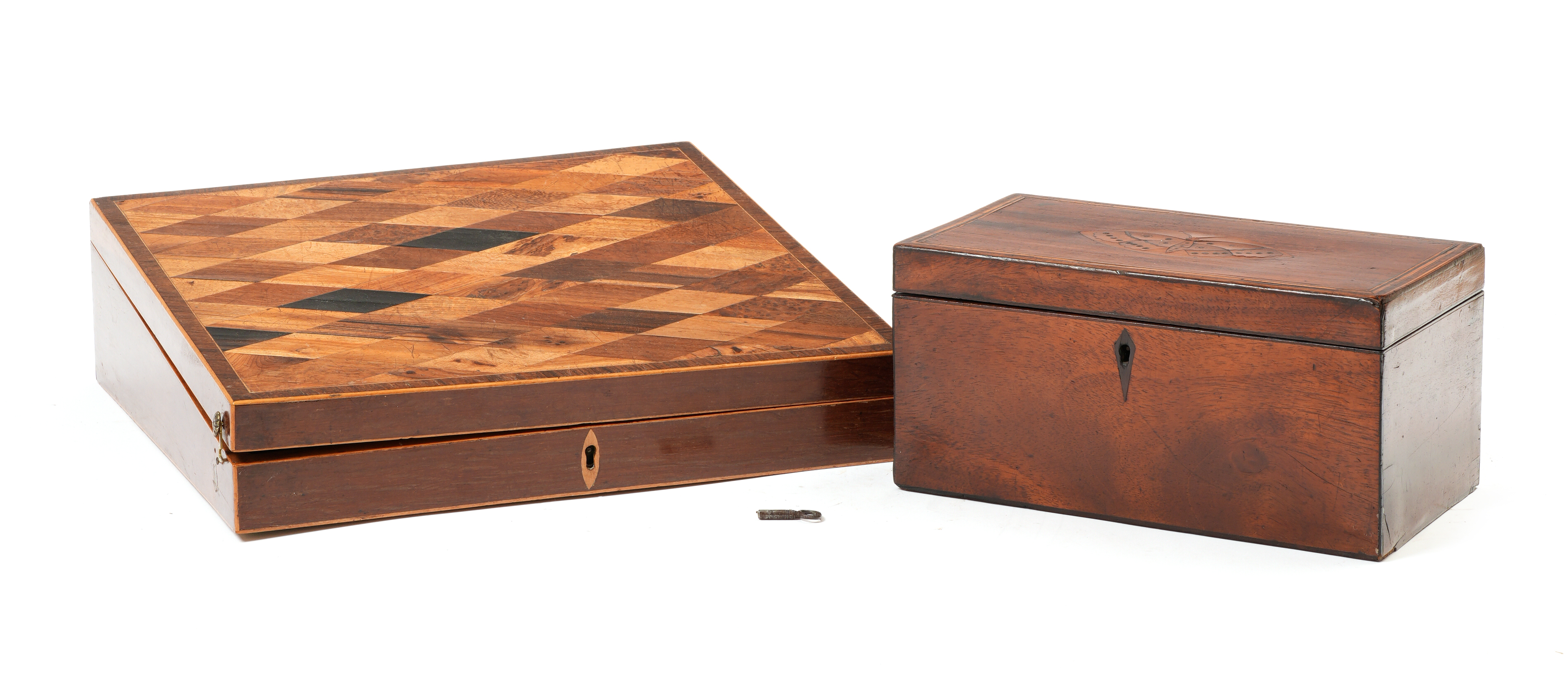 the hinged cover decorated with cube parquetry, enclosing a fitted and paper-lined interior with two stoneware inkwells, together with a mahogany tea caddy, the cover inlaid with a butterfly navette panel enclosing a twin interior with covers (2)