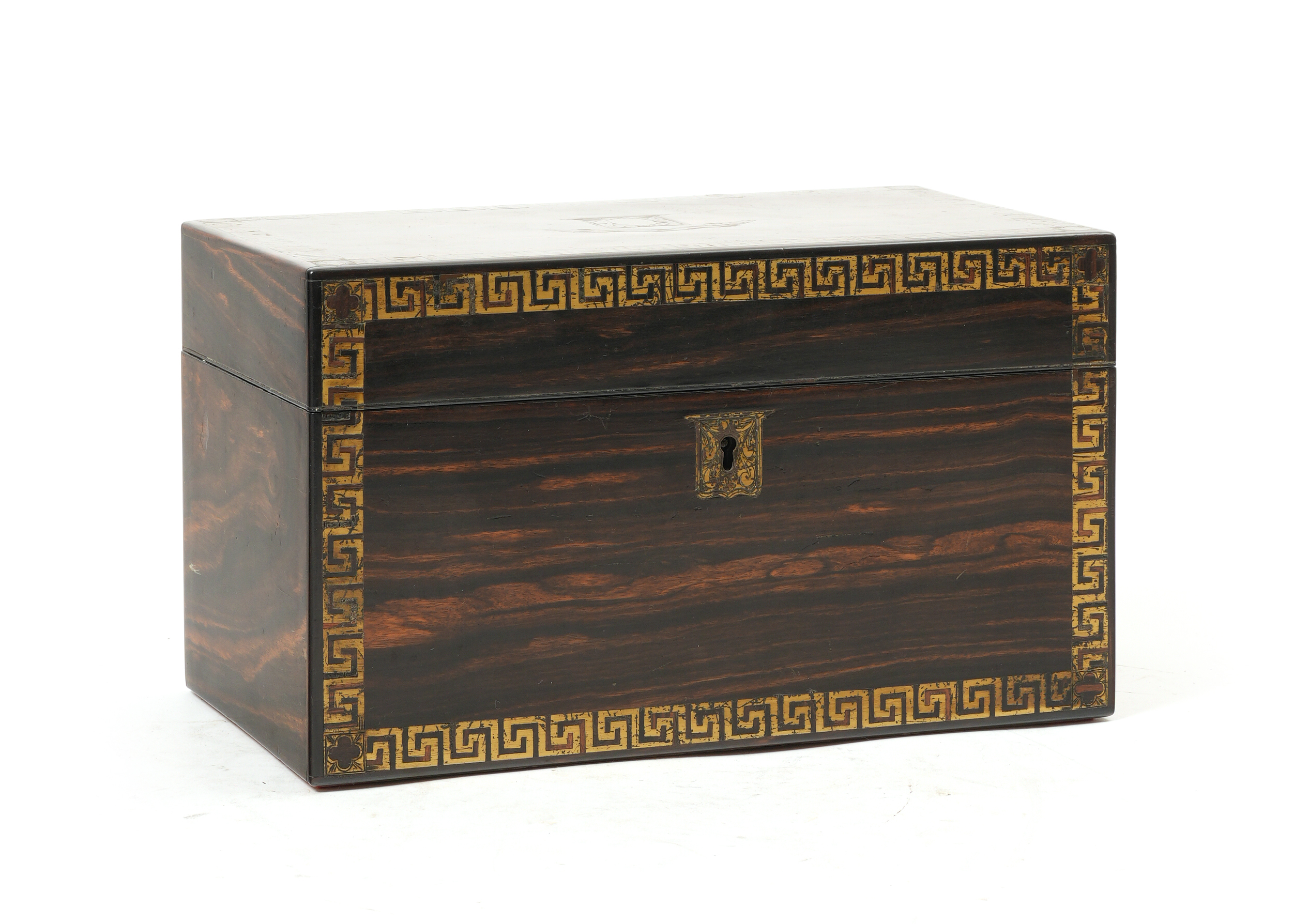 the cover with a central crest and brass Greek key decoration to the borders, enclosing a pair of satinwood canisters with domed covers and brass plaques inscribed 'B' and 'G'