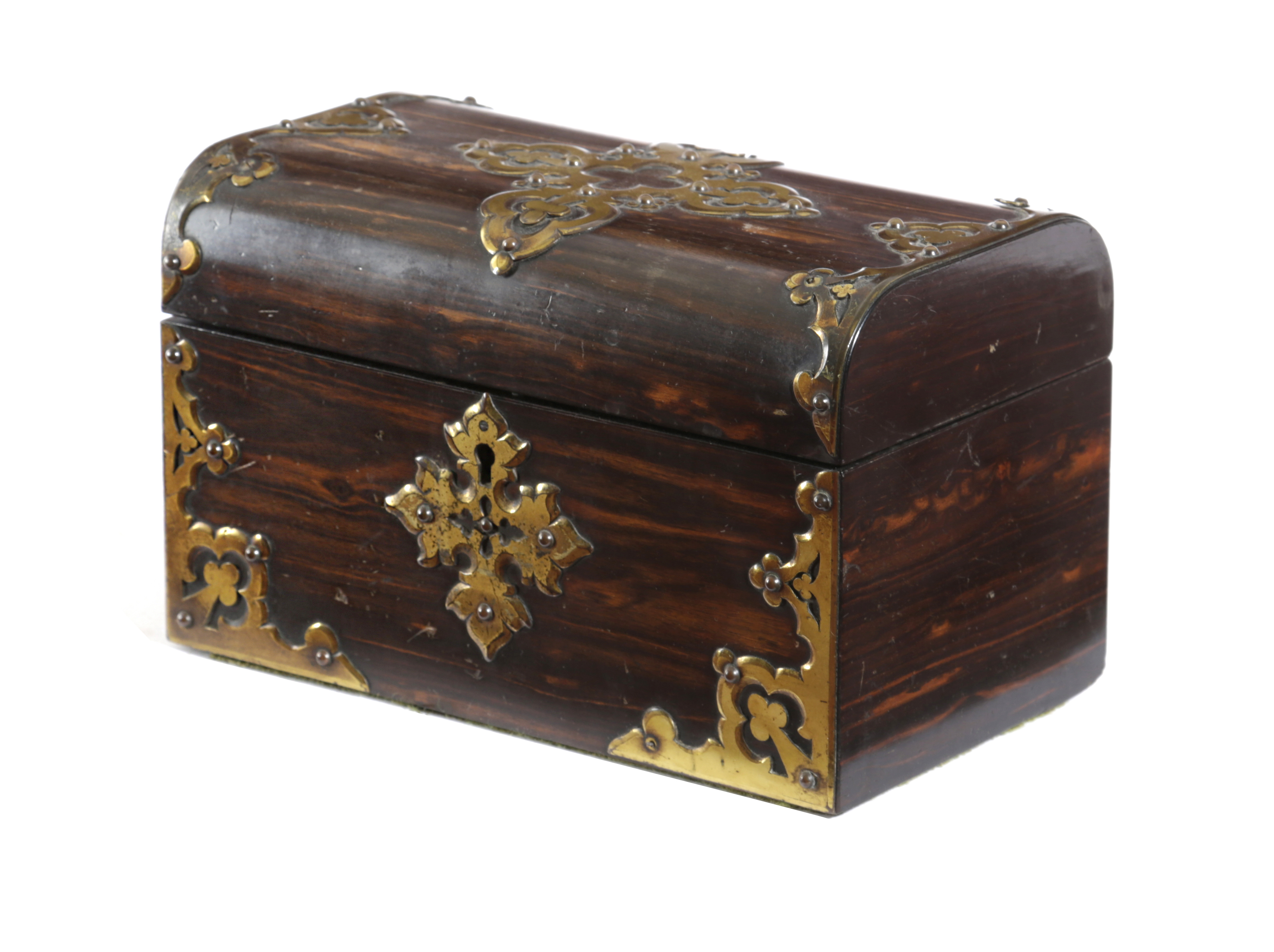 with brass strapwork mounts, the interior with a pair of domed lidded compartments