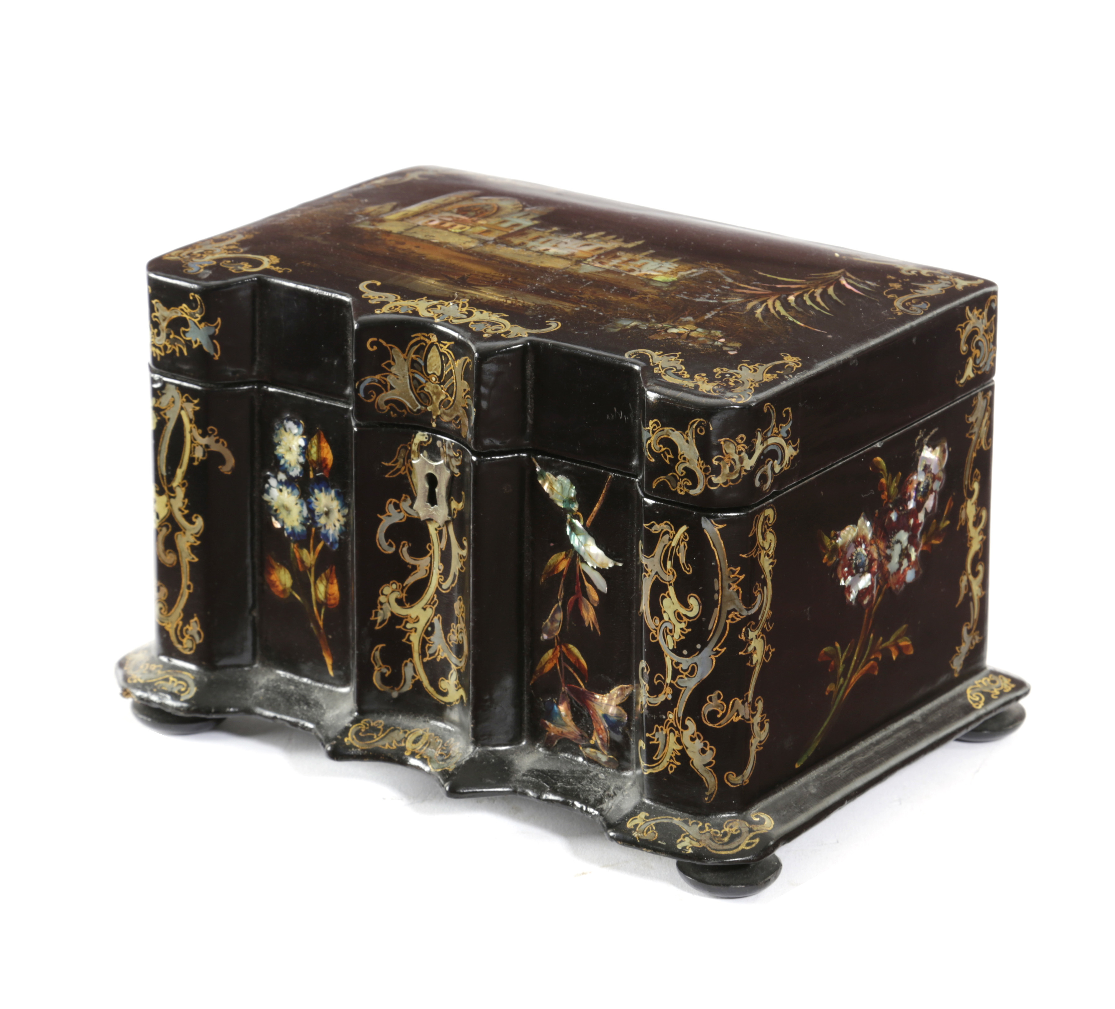 A VICTORIAN PAPIER-MACHE AND MOTHER OF PEARL TEA CADDY
