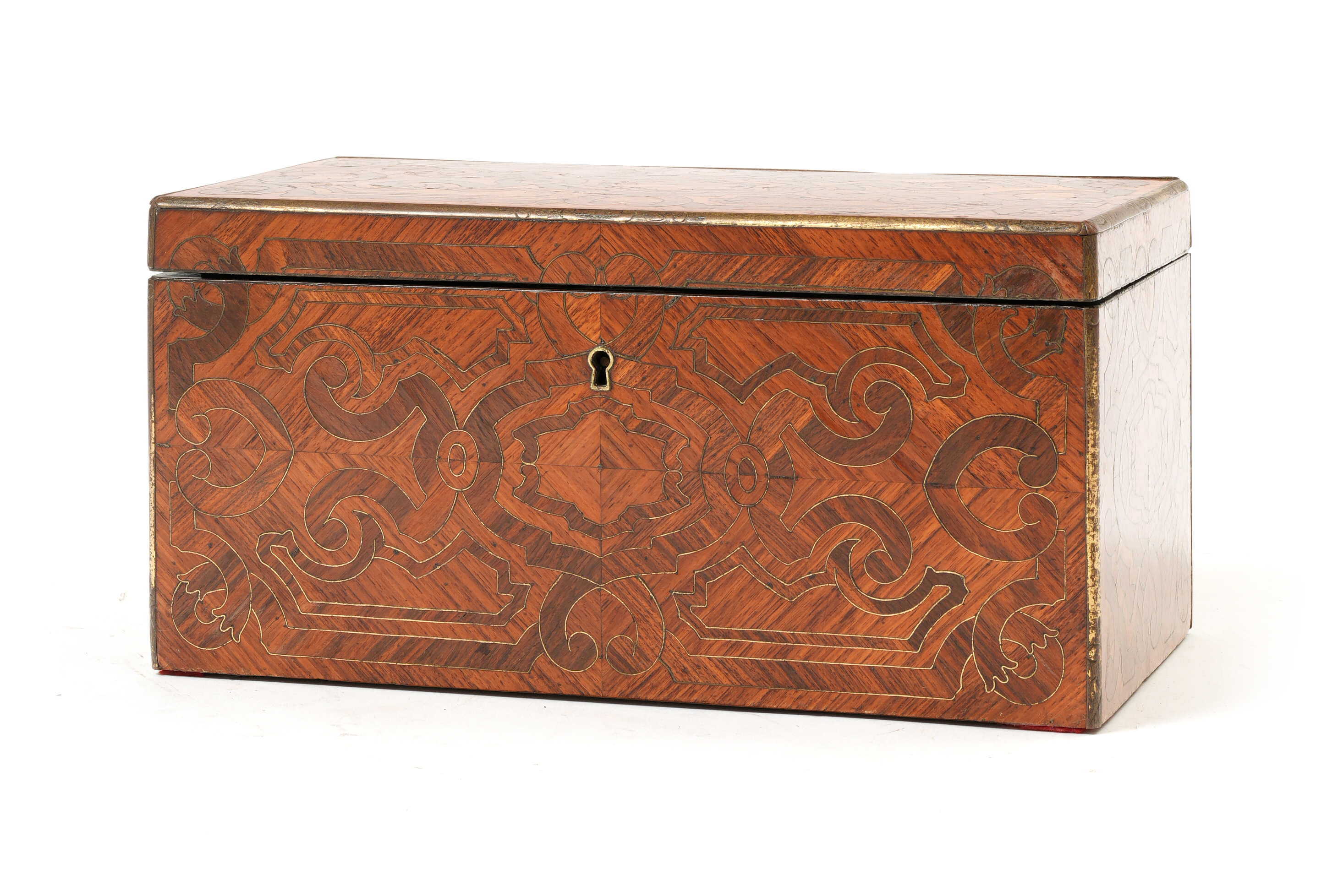 A FRENCH KINGWOOD AND MARQUETRY TEA CADDY
