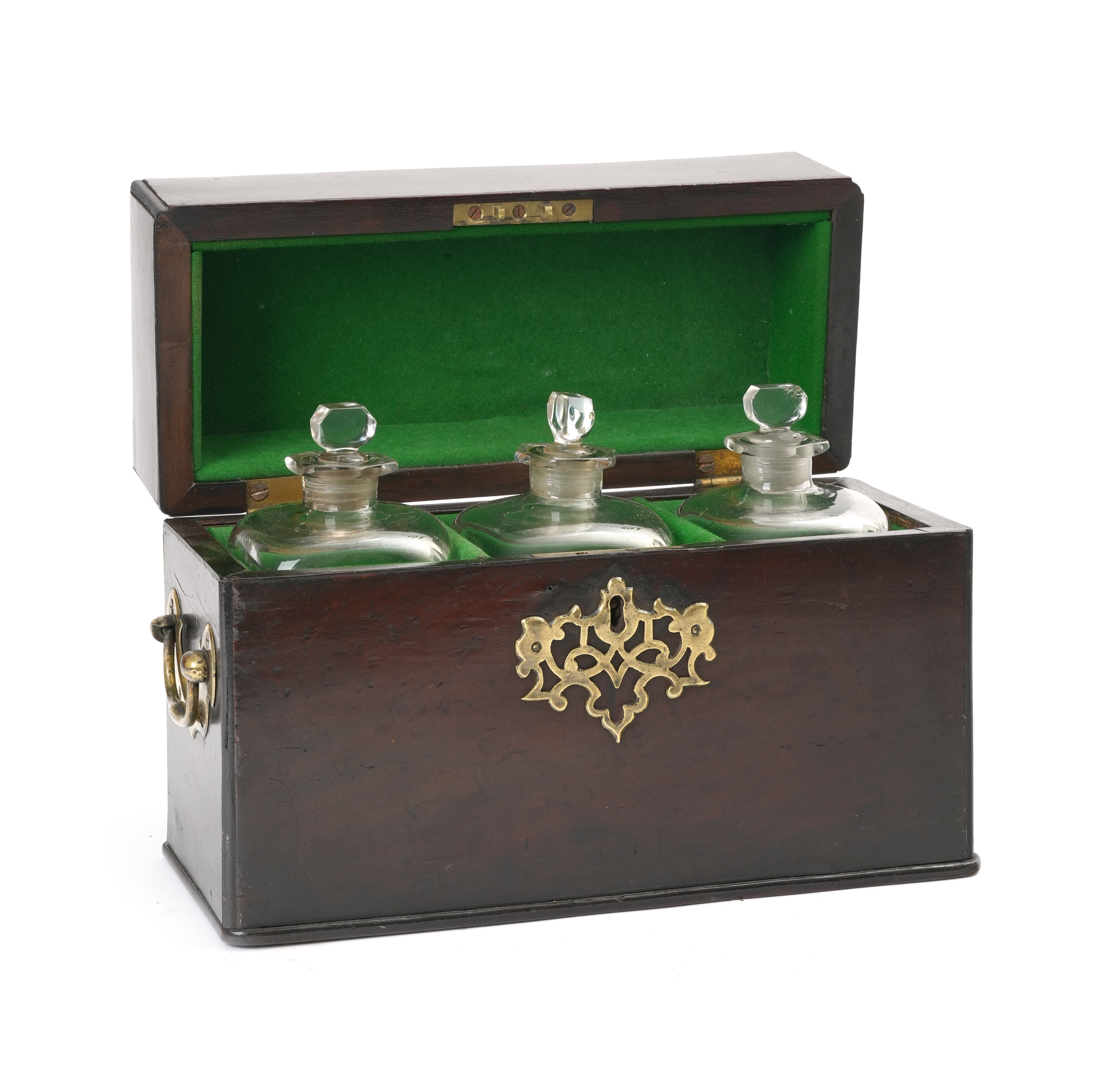 of rectangular form, the hinged cover enclosing three square section glass decanters and stoppers, with a fretwork brass escutcheon and a pair of swing handles