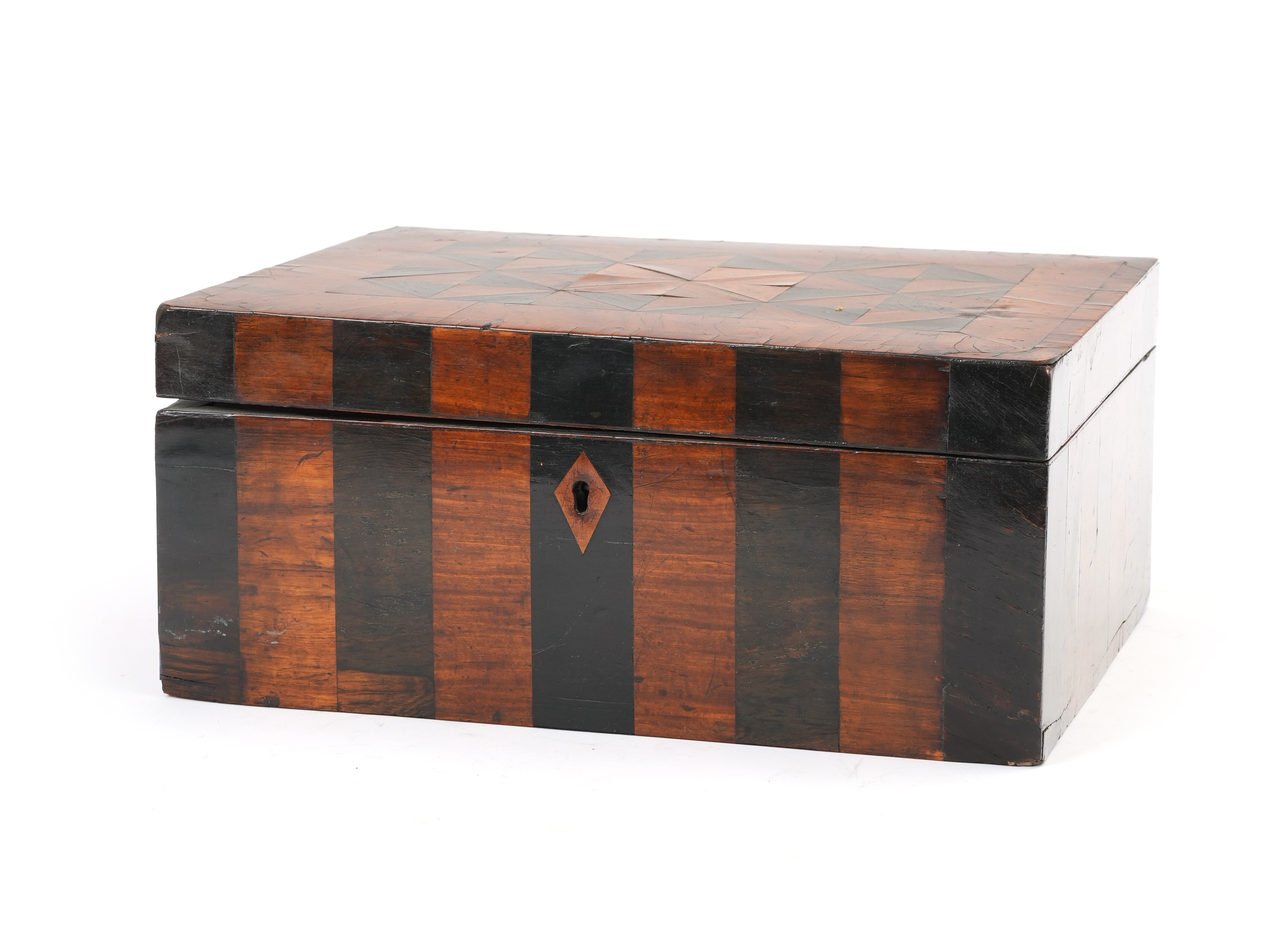 of rectangular form, the cover inlaid with specimen wood triangles and enclosing a lift-out fitted tray