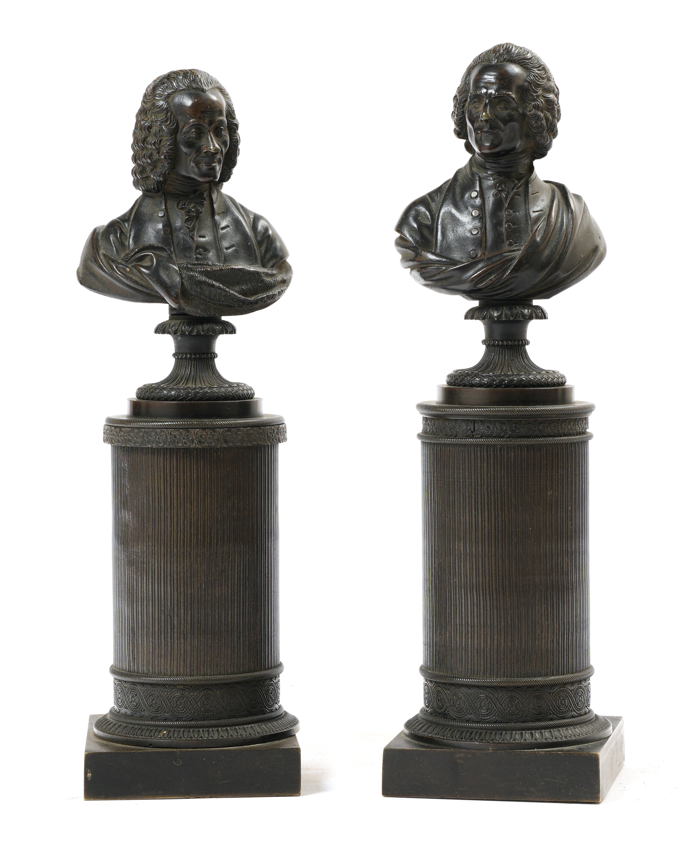 A PAIR OF FRENCH BRONZE BUSTS OF VOLTAIRE AND ROUSSEAU