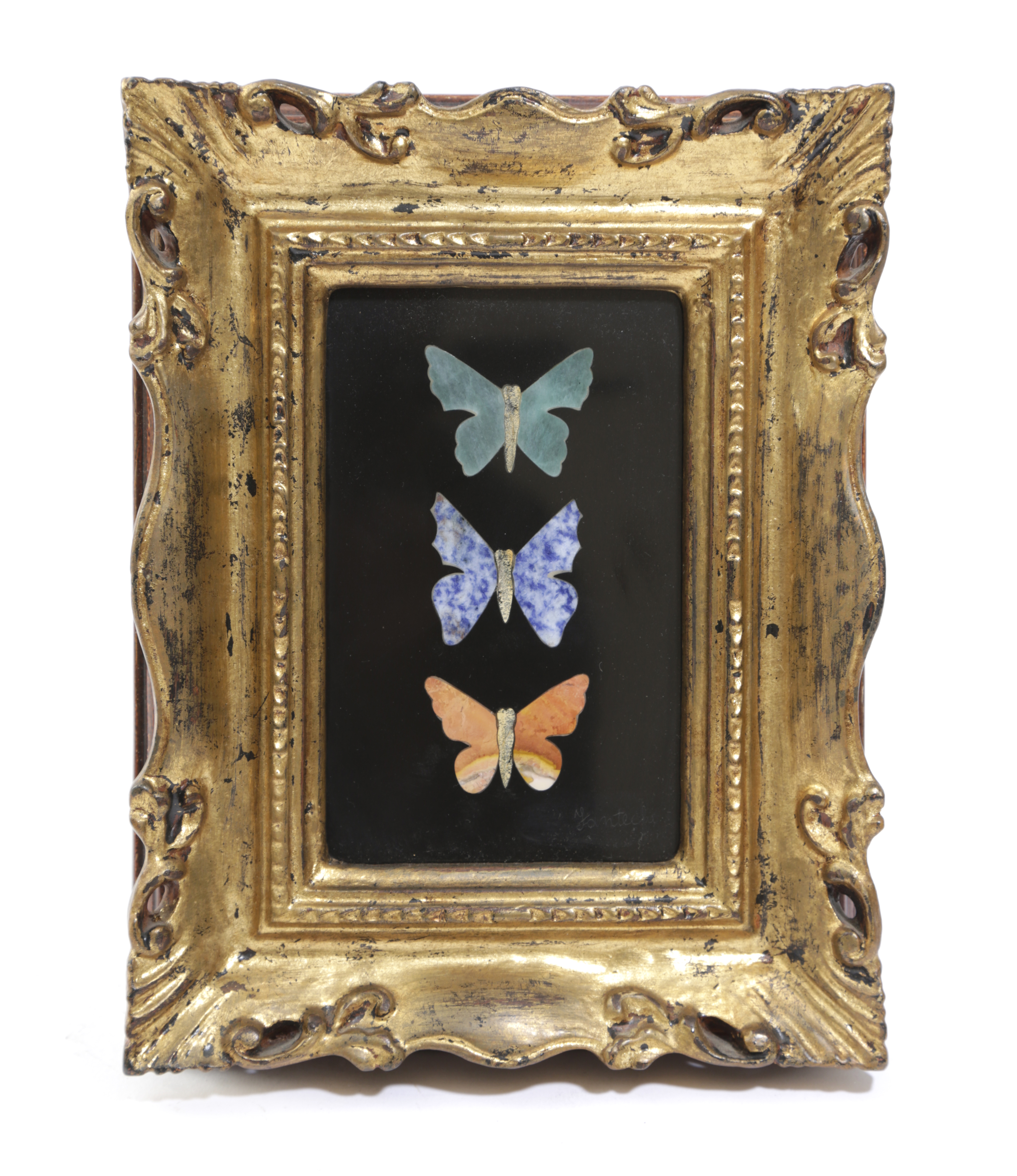 with three butterflies in a variety of semi-precious stones set into a black marble ground, in a gilt frame