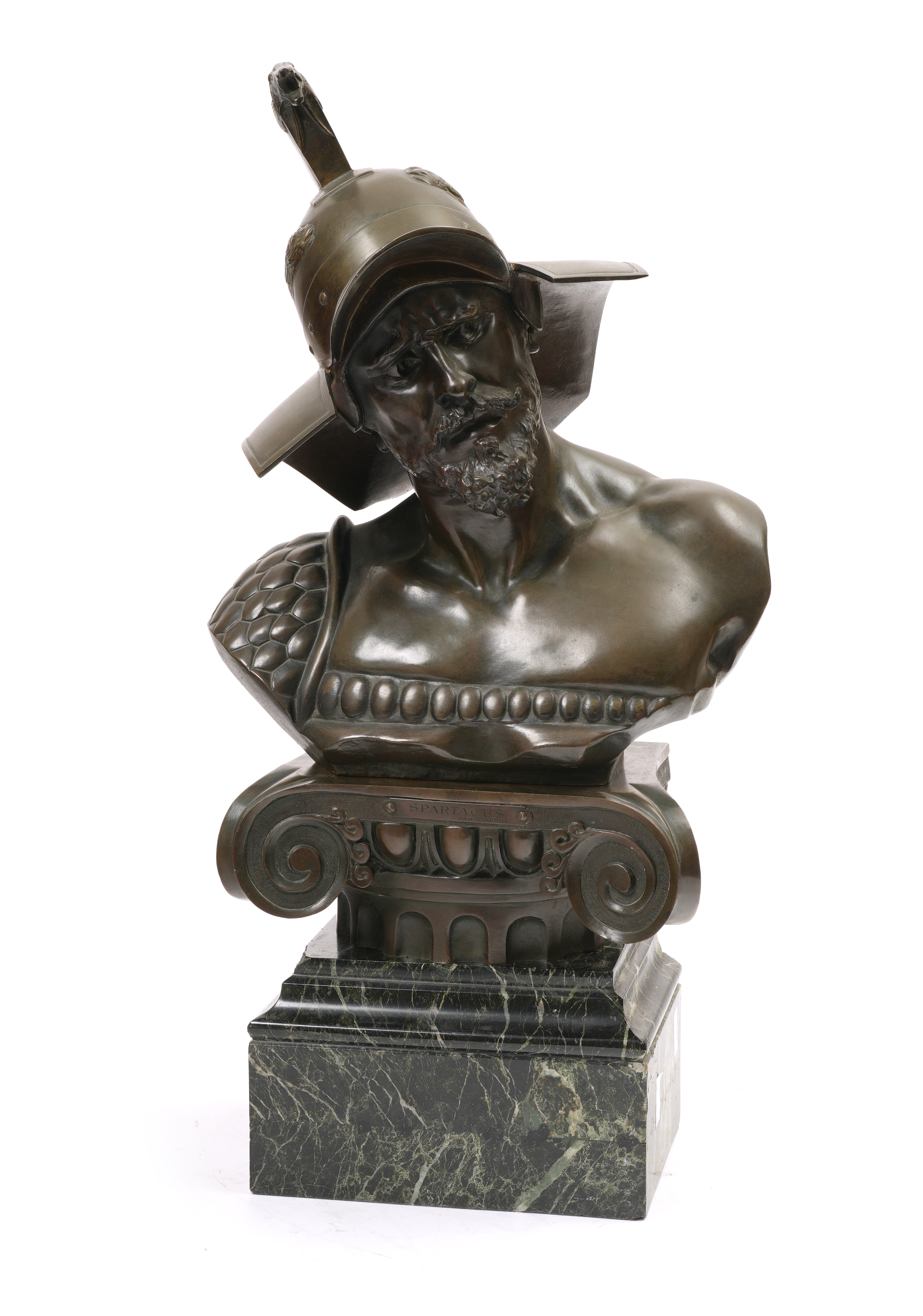 the bearded figure wearing a helmet, the reverse with a foundry pastille inscribed 'vrai bronze garanti Paris' , his left shoulder signed 'H. Aurilli' and on a separate Doric capital with an applied label inscribed 'Spartacus par R. Aurilli', together with a verde antico marble plinth