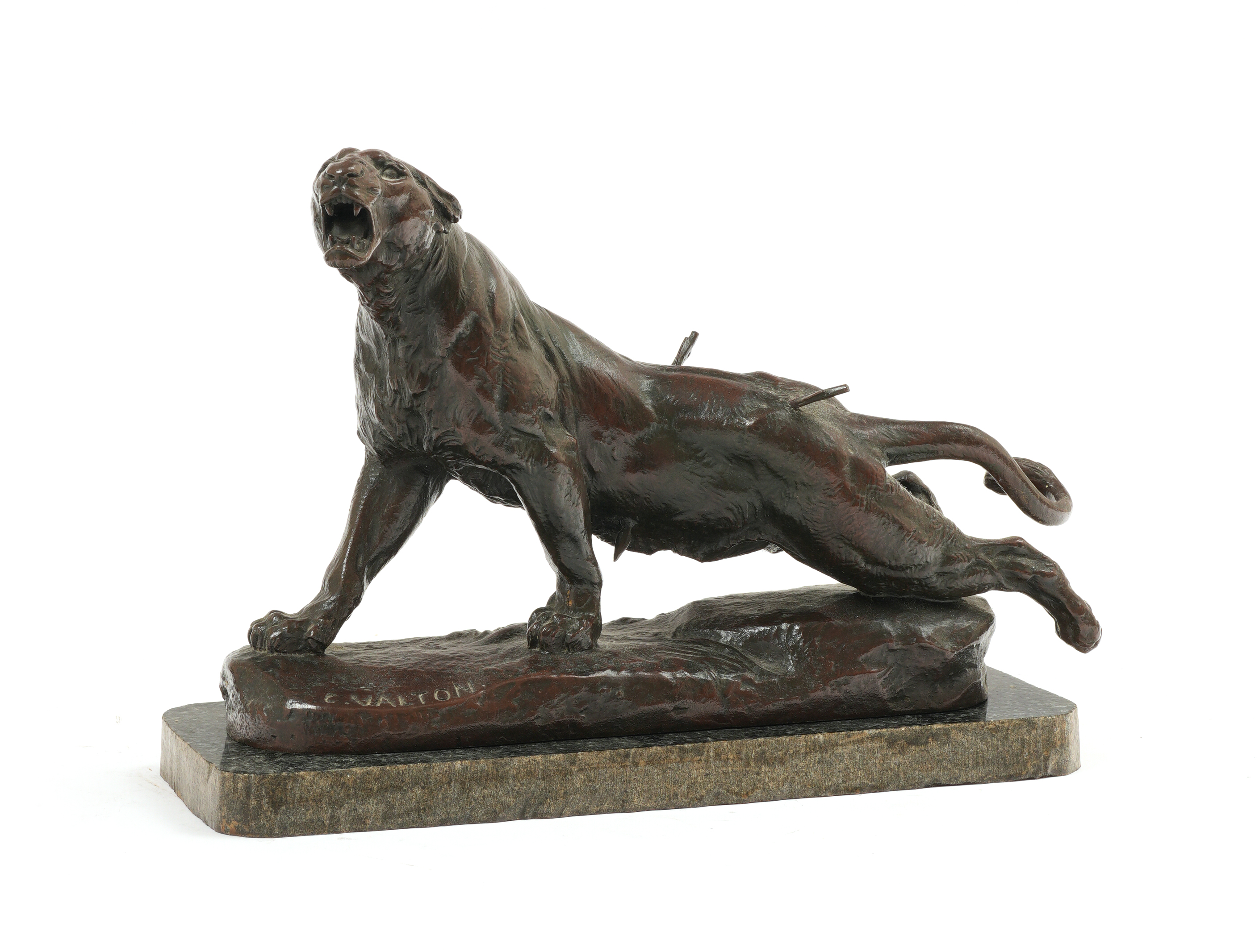 A FRENCH BRONZE ANIMALIER MODEL OF A WOUNDED LIONESS