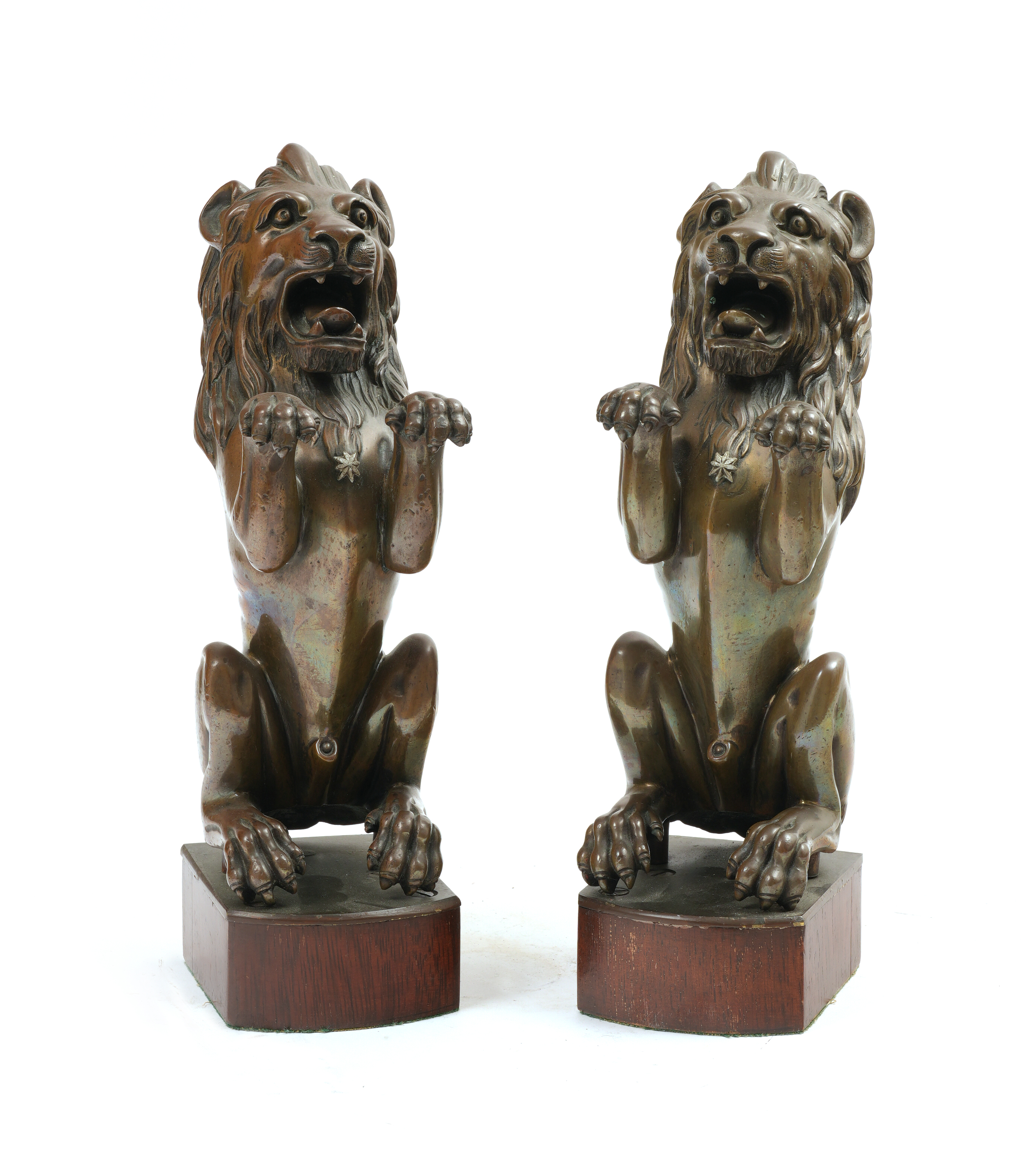 A PAIR OF BRONZE MODELS OF HERALDIC LIONS RAMPANT
