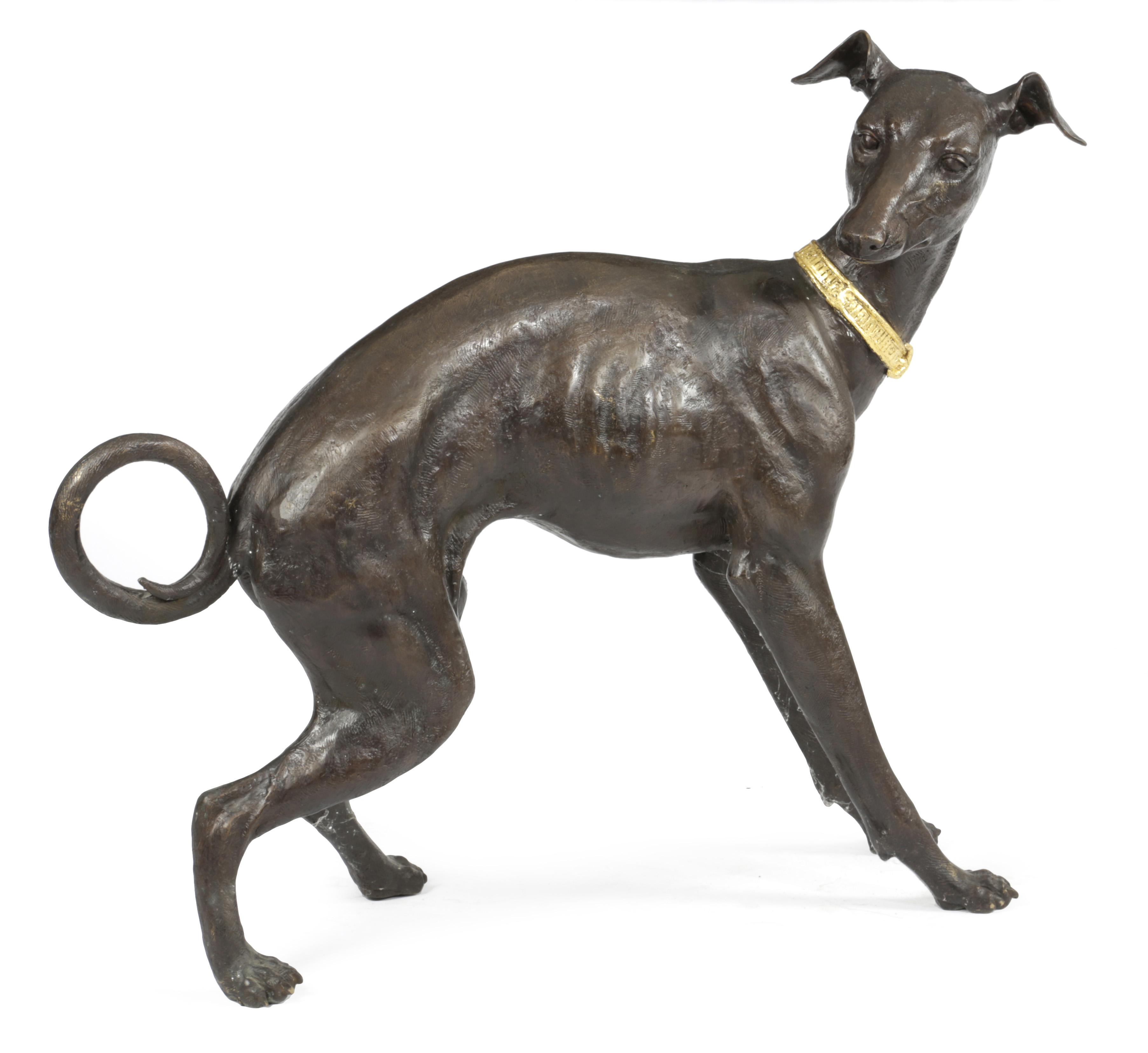 A LIFE SIZE BRONZE SCULPTURE OF A LURCHER