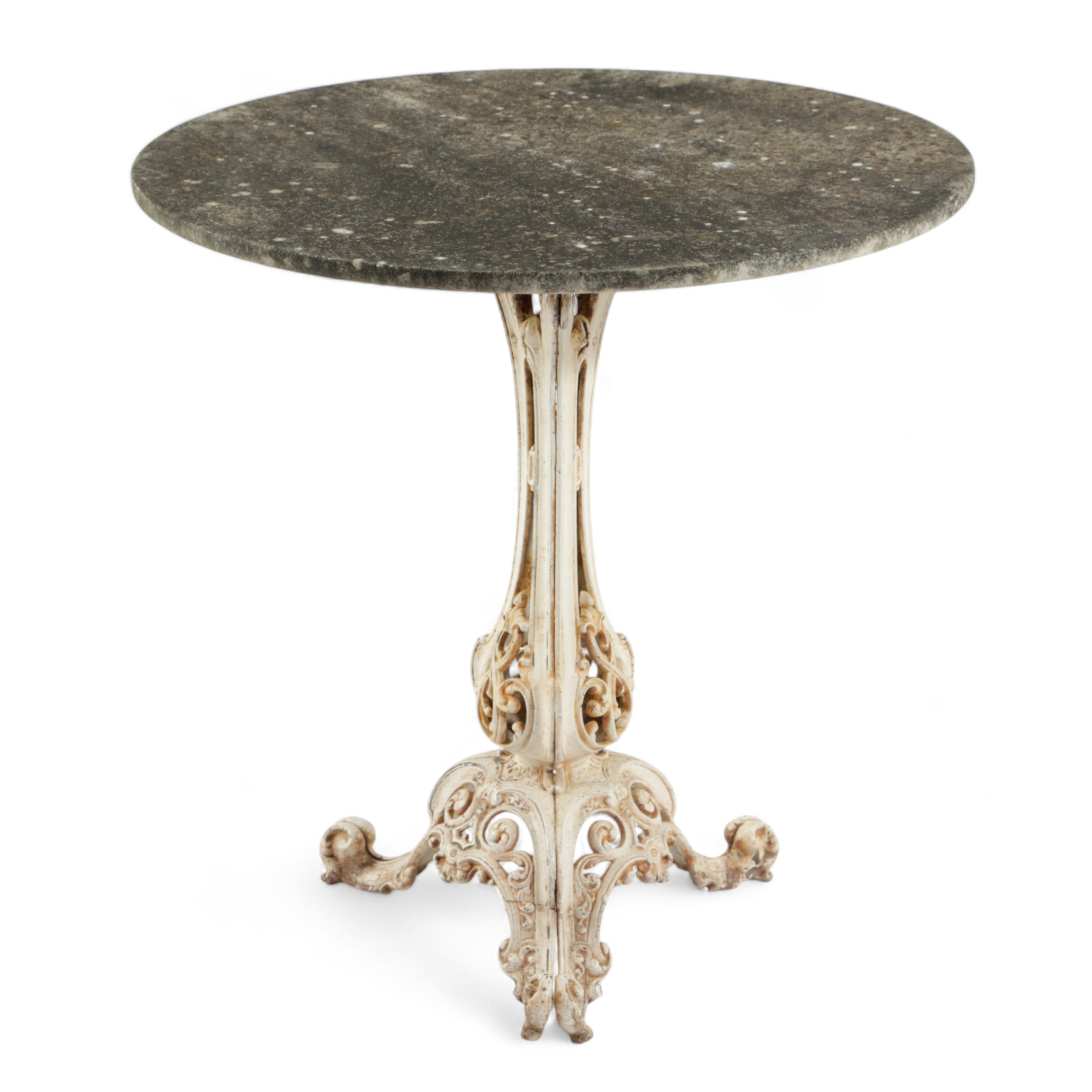 the white marble top on a reticulated baluster stem with a scrolling tripod base, with registration diamonds