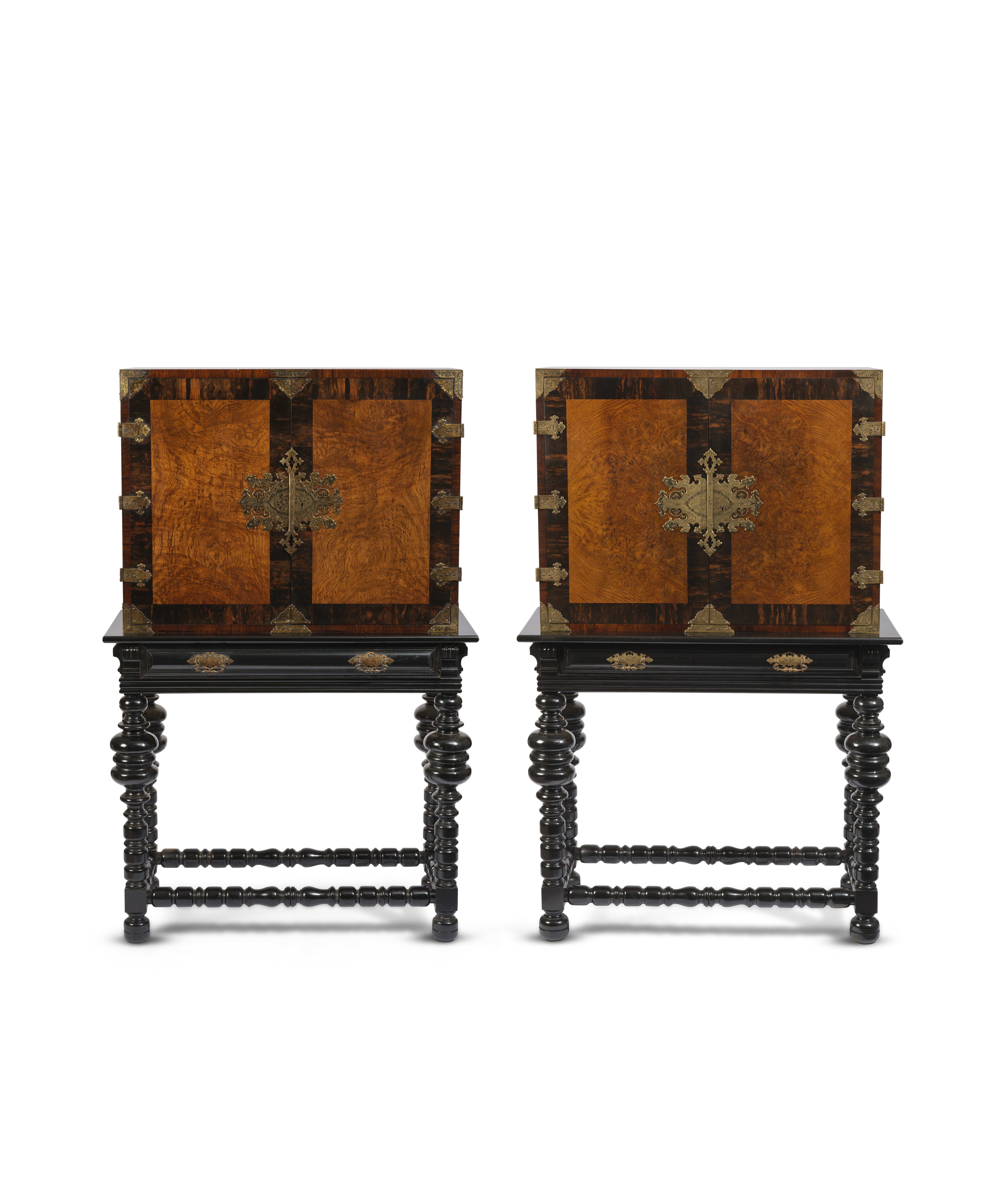 λ A NEAR PAIR OF BURR OAK, COROMANDEL AND ROSEWOOD CABINETS ON STANDS