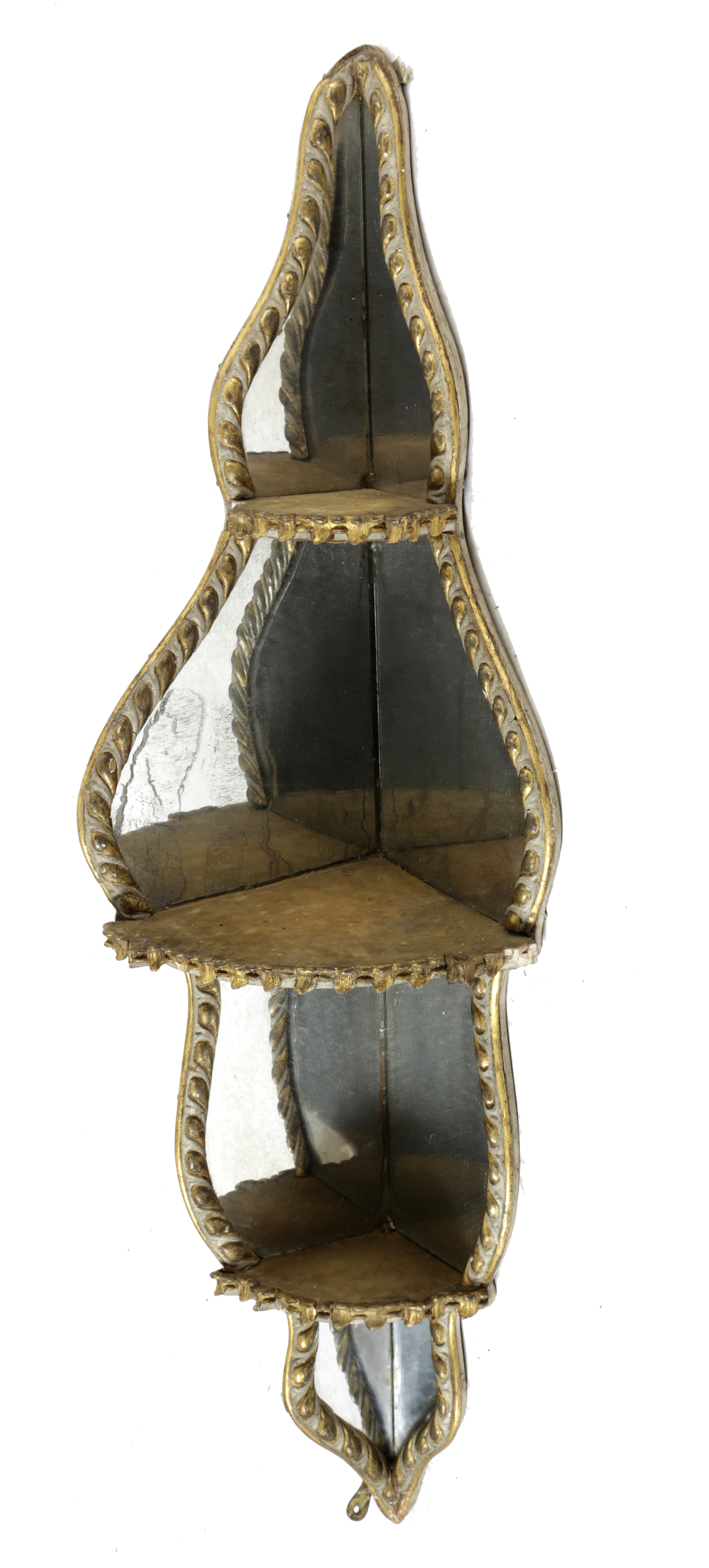 the three graduated, mirror-backed tiers, with gadrooned frames and gilt gesso rocaille shelf edges