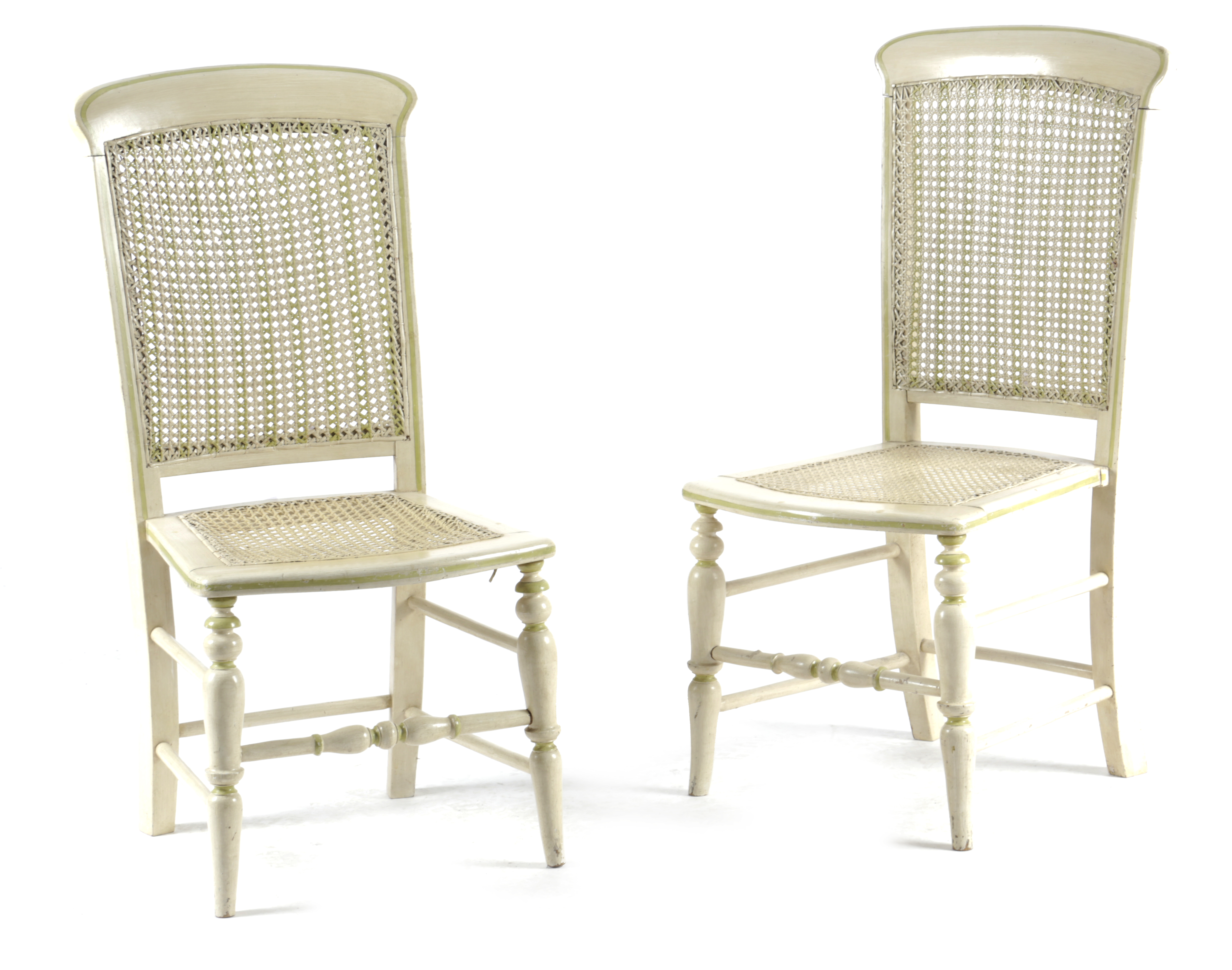 each with a caned back and seat painted in cream with green line detail and an upholstered cushion (2)