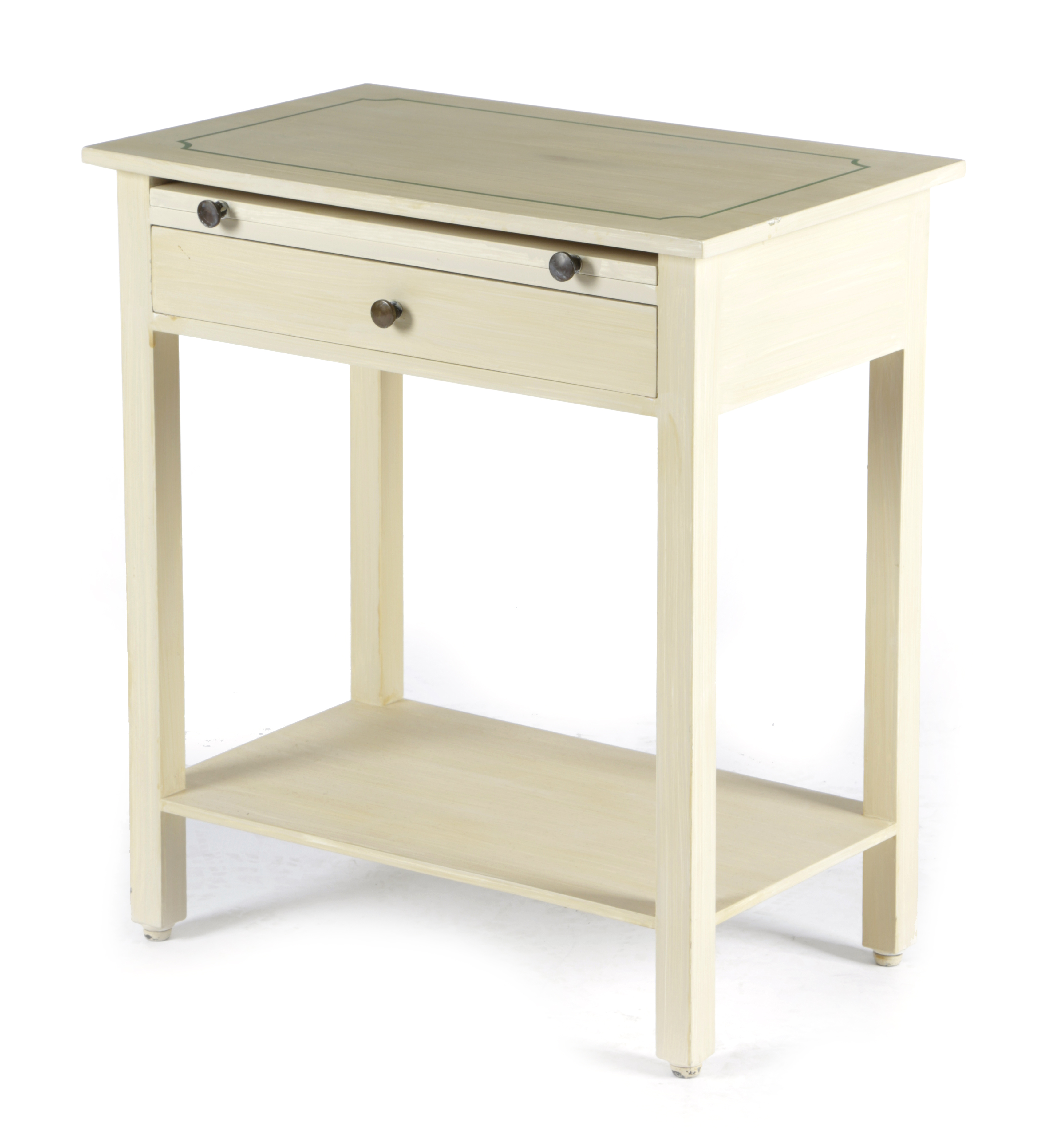 with a slide above a single drawer and a shelf stretcher, in cream with green line detail