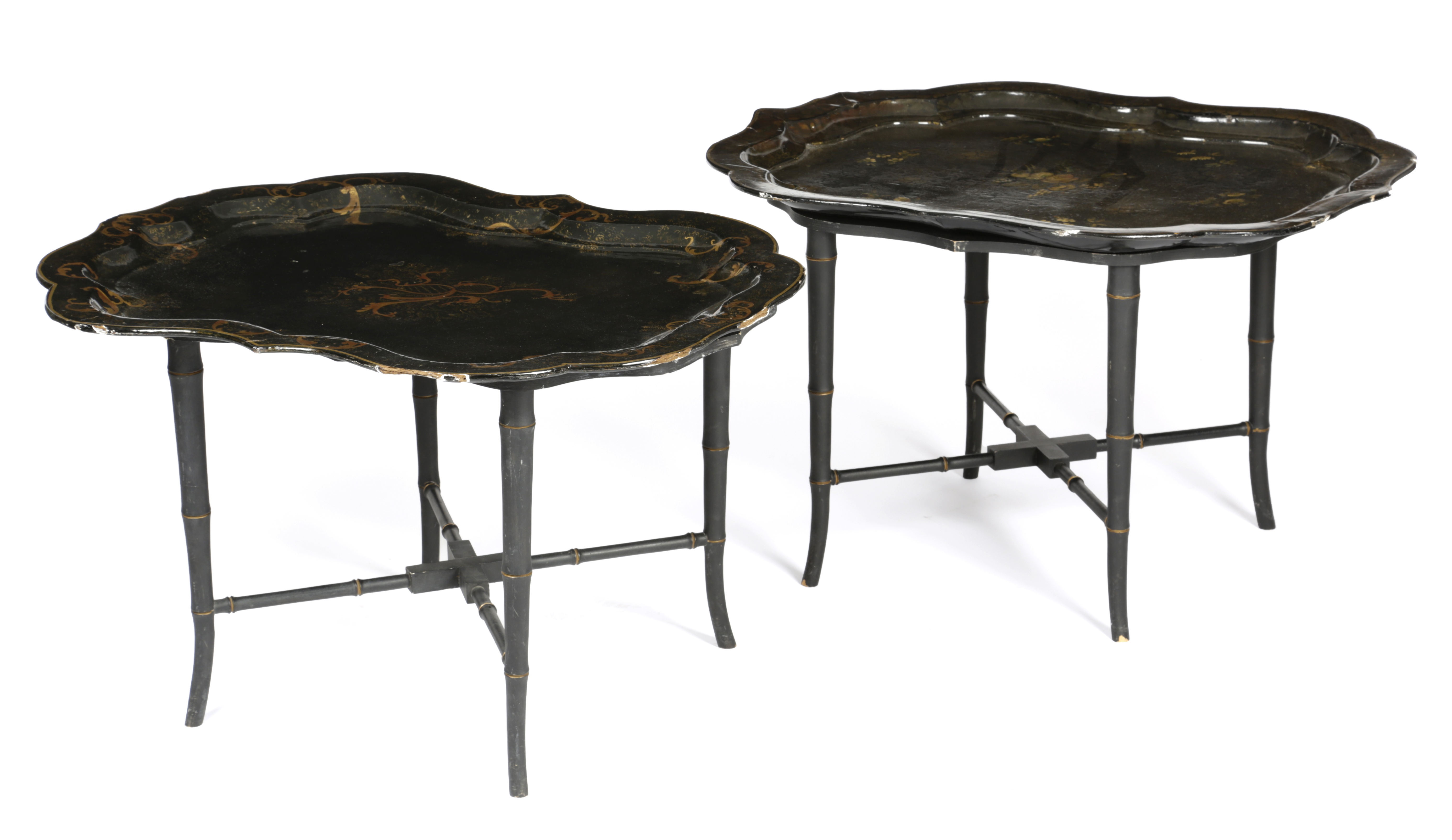TWO VICTORIAN BLACK JAPANNED PAPIER-MACHE TRAY TABLES