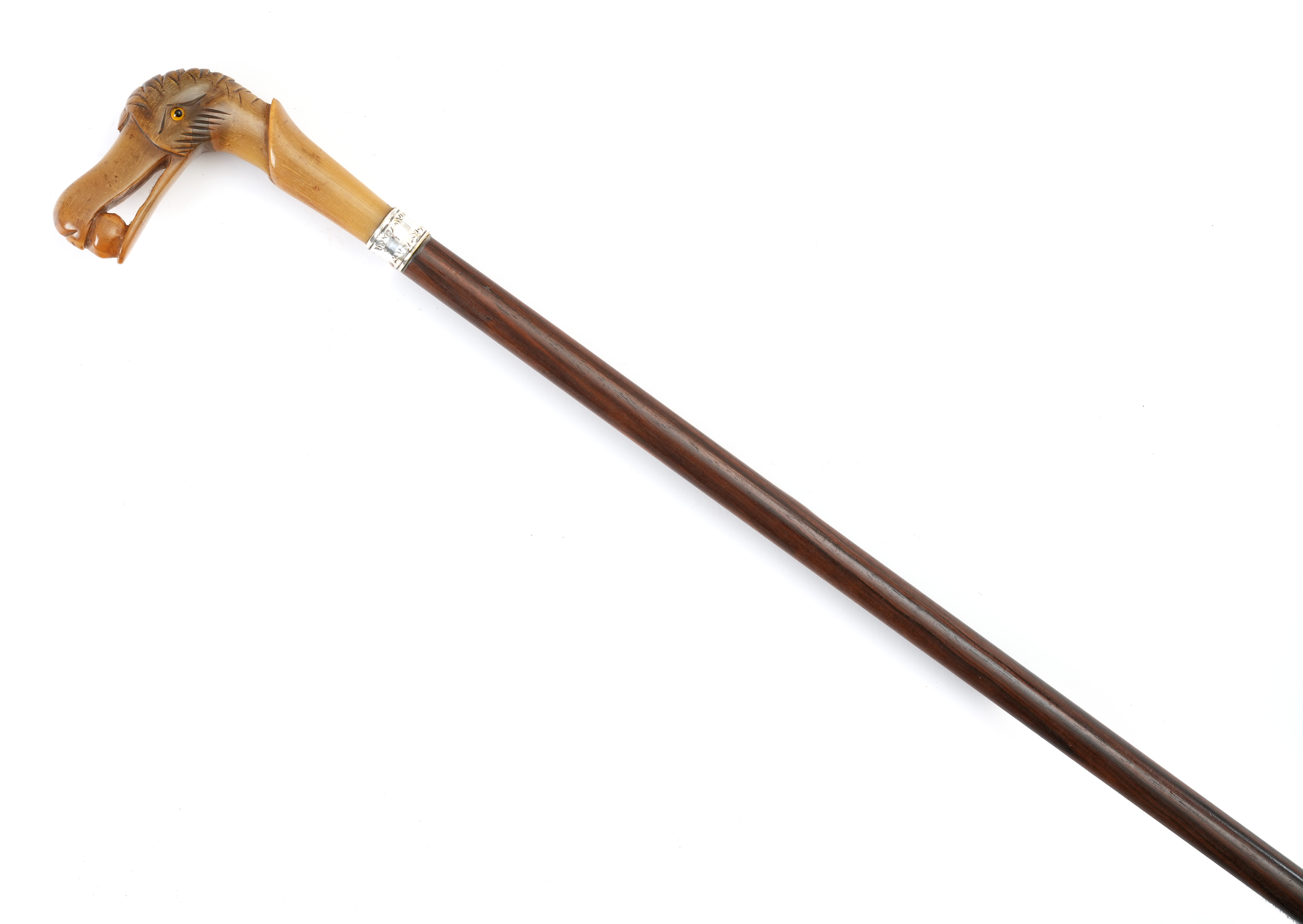 the handle carved as a dodo with glass eyes, above an engraved silver collar, on a rosewood shaft with a horn ferrule