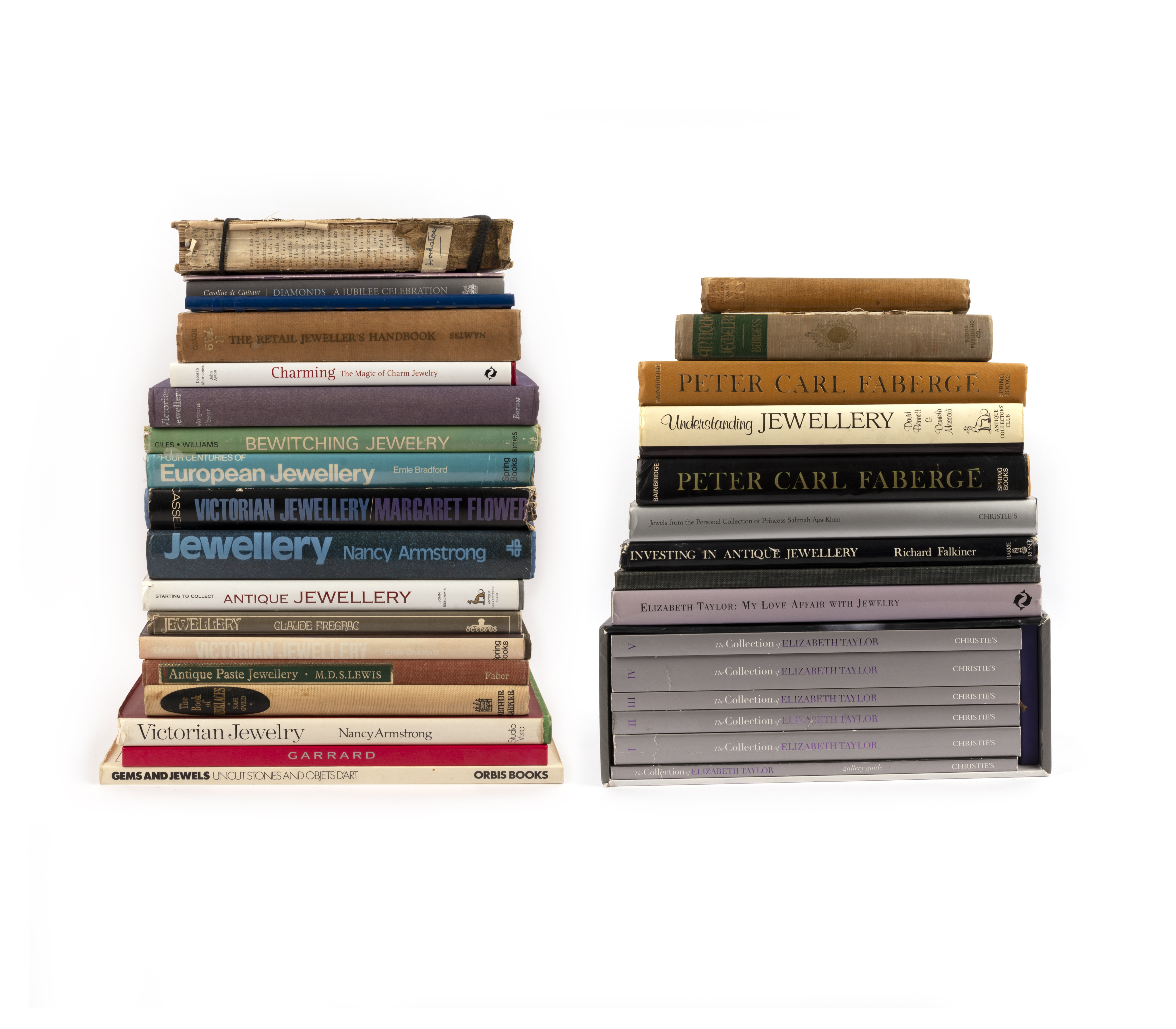 A collection of jewellery reference books, comprising thirty books, including Sah Oved, Book of Necklaces; Henry Charles Bainbridge, Peter Carl Fabergé; David Bennett and Daniela Mascetti, Understanding Jewellery; John M Gray, James and William Tassie; and Christie's, The Collection of Elizabeth Taylor, boxed catalogue collection, and Jewels from the Personal Collection of Princess Salimah Aga Khan