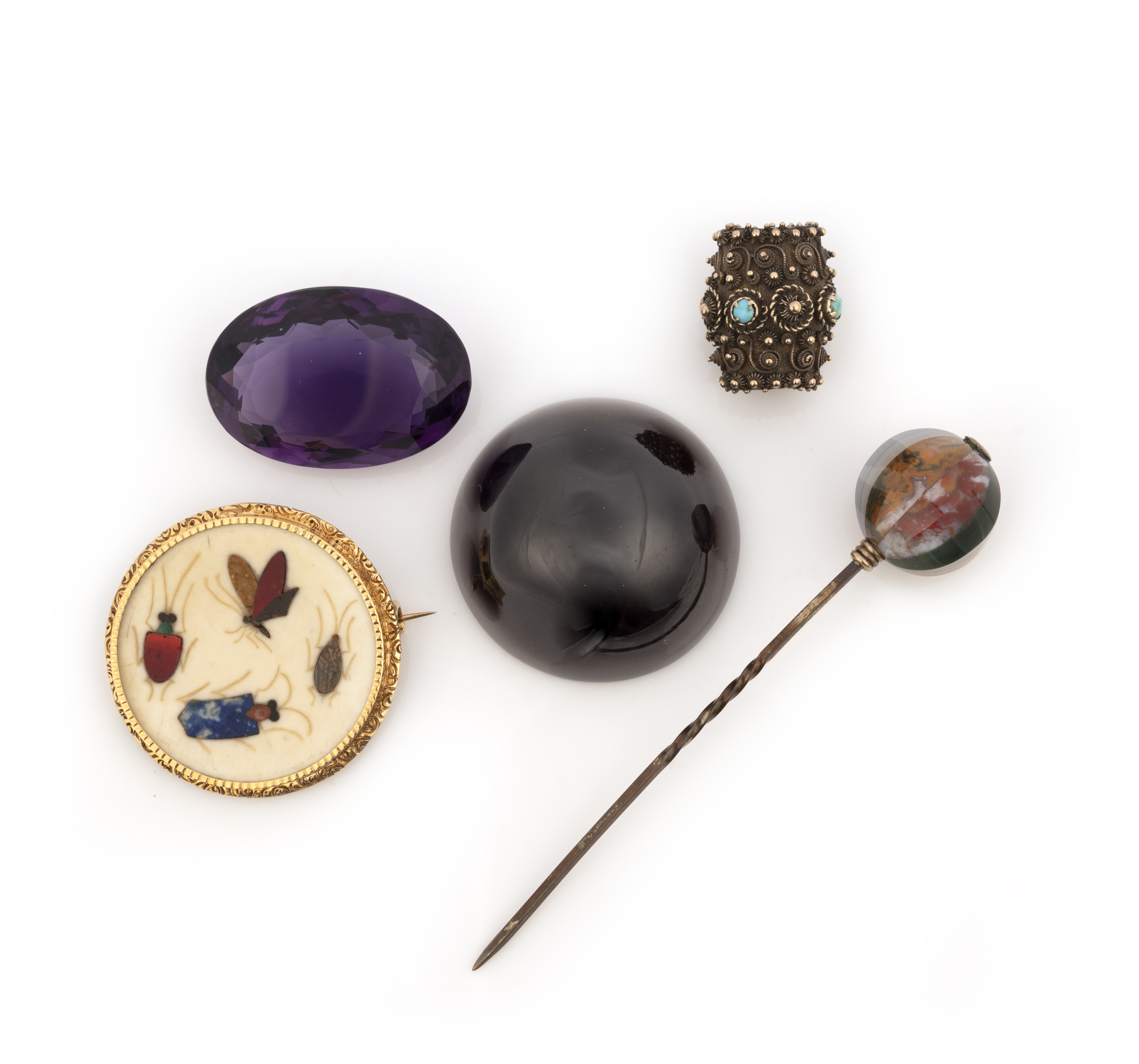 A collection of jewels, comprising: a large cabochon garnet, hollowed to the reverse, approximately 3.5 x 3.5 x 1.6cm, approximately 159 carats; a Scottish hardstone stick pin; a resin and hardstone inlay brooch depicting insects, framed in gold, 3.4cm diameter; an unmounted oval amethyst, approximately 56 carats; and a gold filigree link set with turquoise cabochons, circa 1830s