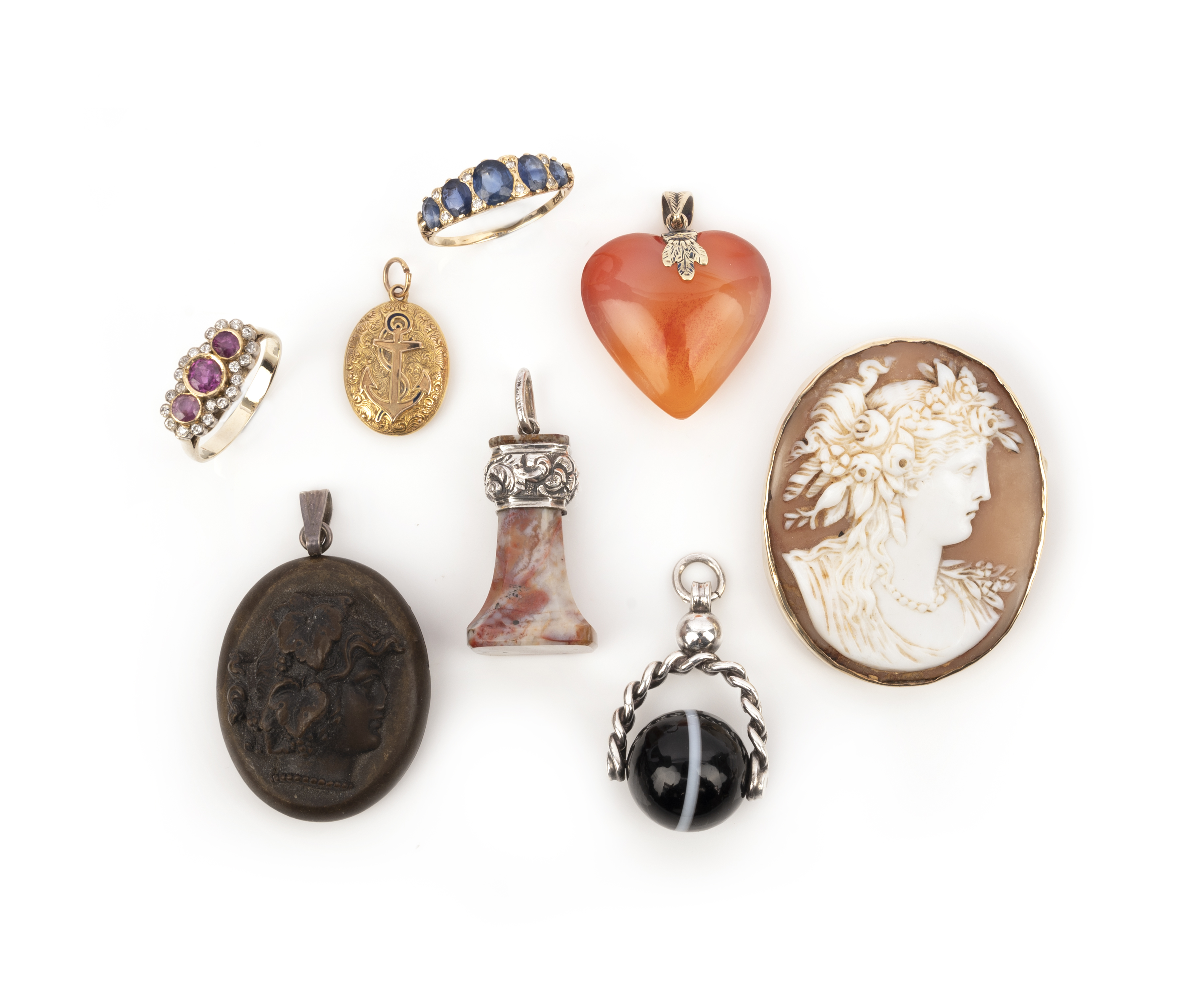 A collection of jewels, comprising: a ring set with three circular-cut rubies within borders of brilliant-cut diamonds, mounted in gold, size P; a sapphire five-stone ring accented with brilliant-cut diamonds, mounted in gold, size P, stamped 15ct; a shell cameo brooch depicting a Bacchante; a carnelian heart pendant; a jasper fob seal; a bog oak locket depicting a Bacchante; a gold locket depicting an anchor, containing a lock of hair; and a silver pendant set with a banded onyx bead