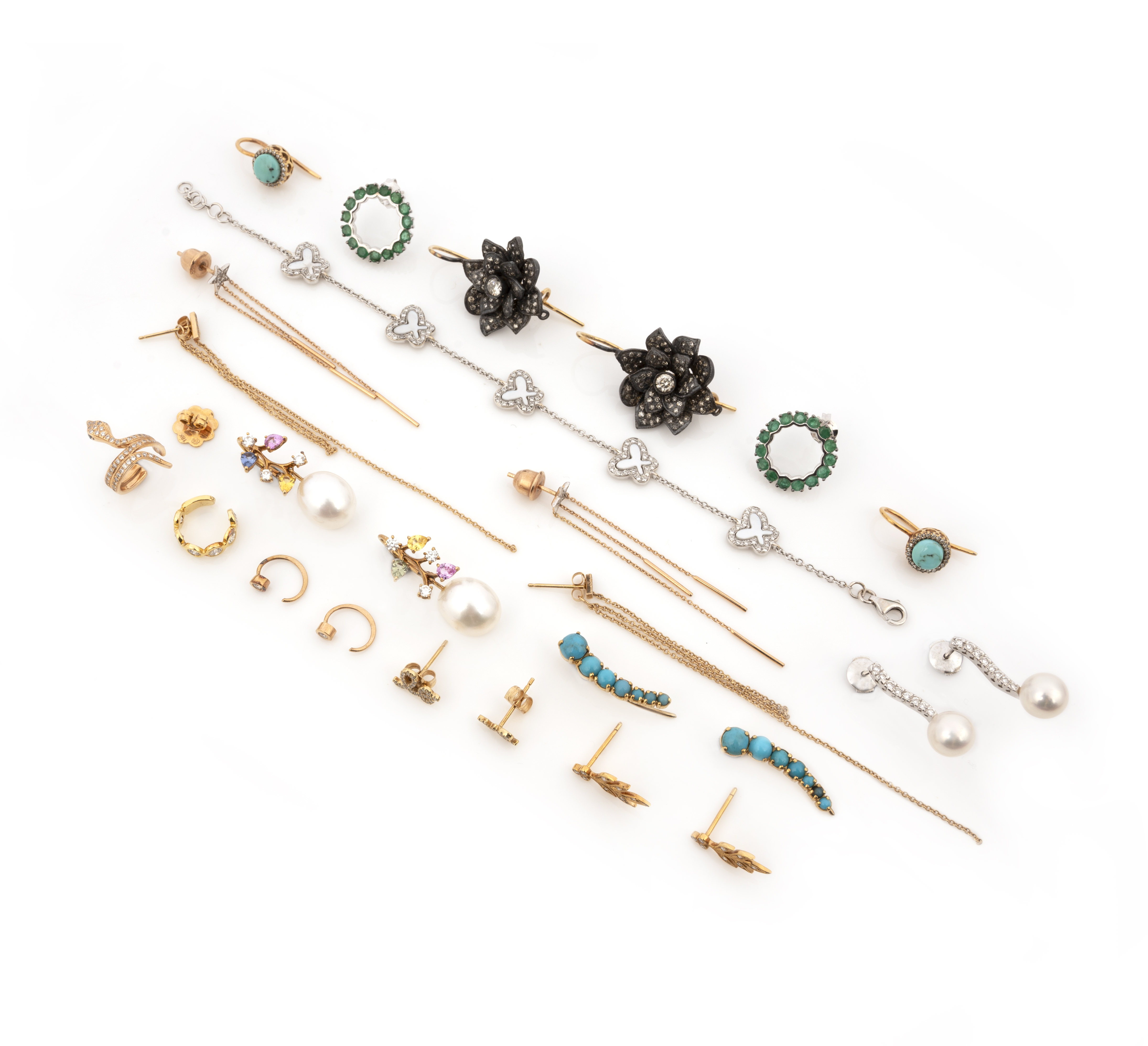 A collection of gem-set and diamond jewels, comprising: a pair of floral earrings in blackened gold set with brilliant- and single-cut diamonds, length 3.3cm each; a pair of turquoise and diamond cluster earrings; a pair of diamond hoops; a pair of earrings set with graduated turquoise cabochons; and a pair of multicoloured sapphire and diamond earrings each suspending a cultured pearl, all mounted in gold, hook fittings; a pair of emerald hoop earrings; a pair of foliate earrings set with brilliant-cut diamonds; a pair of cultured pearl and diamond earrings; a pair of diamond earrings spelling the word 'Love'; and two pairs of diamond earrings, designed as stars and horizontal lines respectively, each suspending a fringe of chain pendants, all mounted in gold, post fittings; together with two gold and diamond ear cuffs; and a bracelet composed of links designed as butterflies, set with mother of pearl and brilliant-cut diamonds, length 17cm, stamped 750