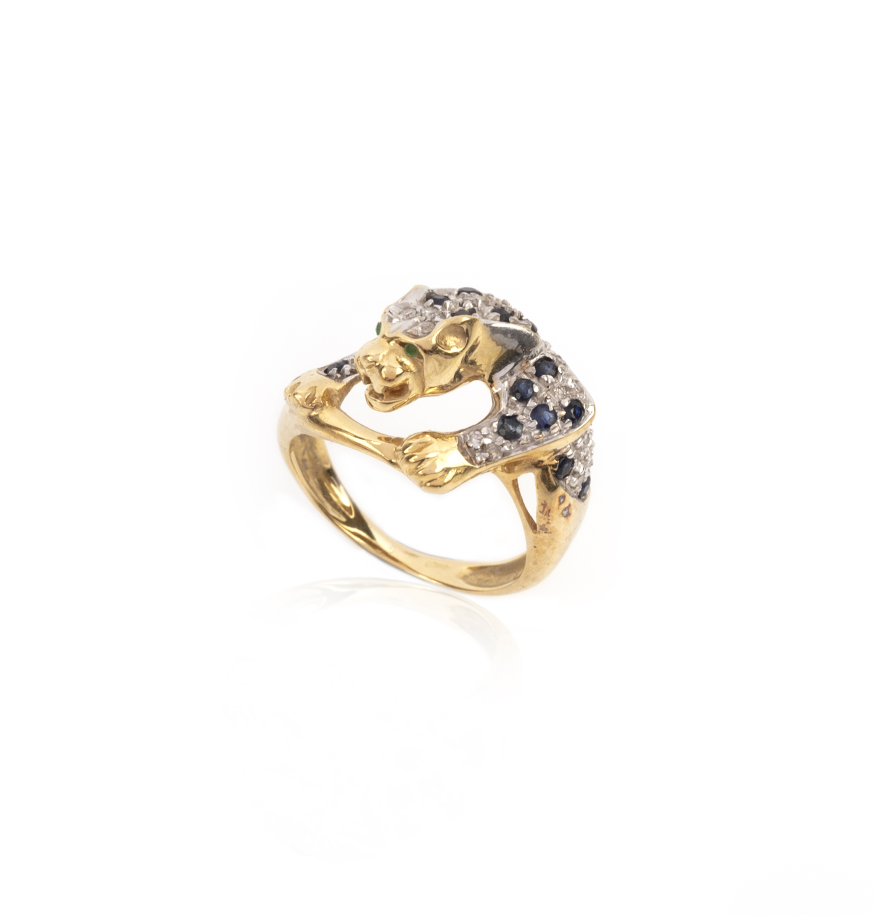 A sapphire and diamond ring, modelled as a panther, set with circular-cut sapphires and single-cut diamonds, its eyes set with green paste, mounted in gold, size N