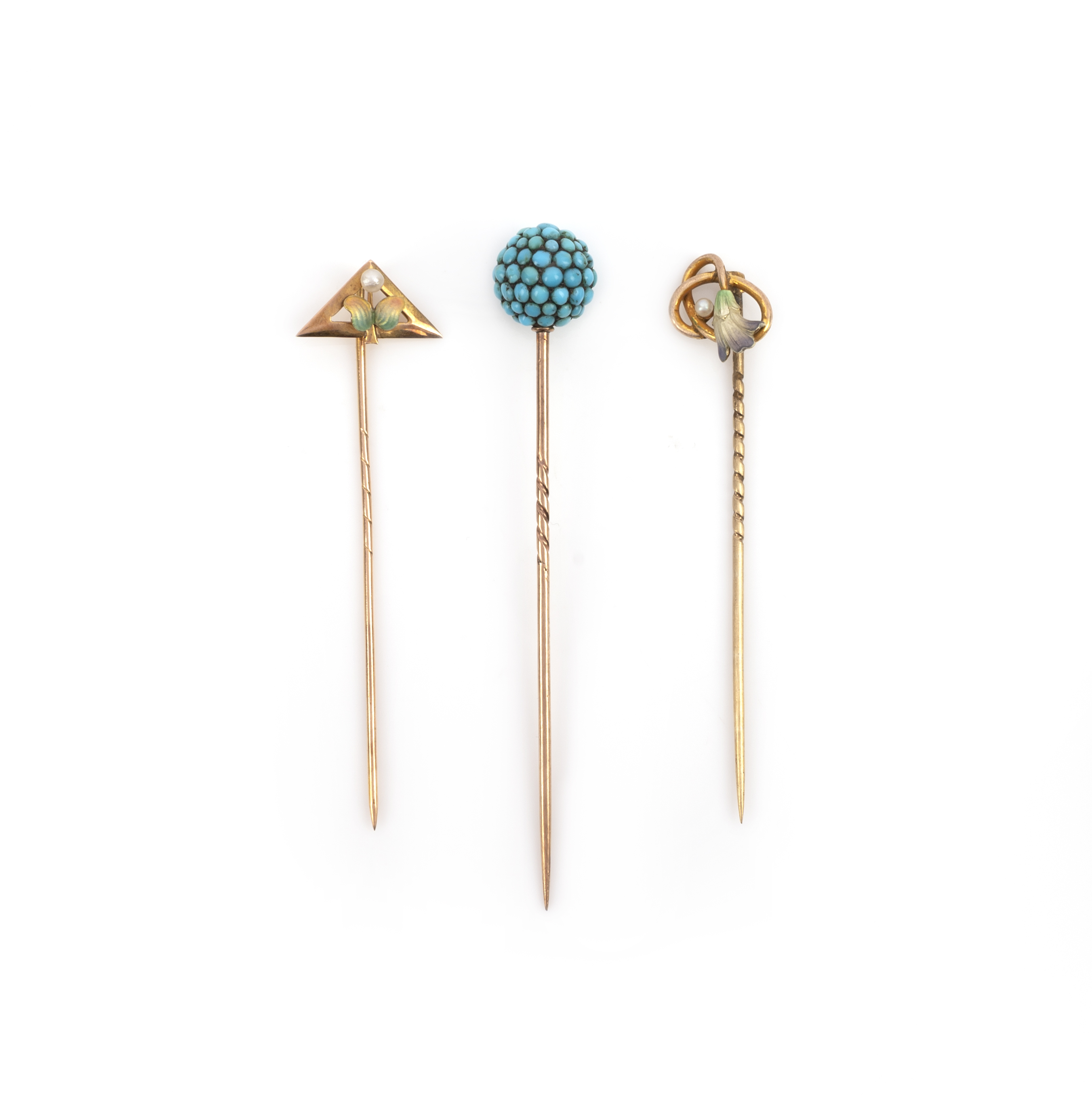 Three stick pins, circa 1900, comprising: one pin capped with a spherical bead pavé-set with turquoise cabochons, length 7.3cm; and two Art Nouveau stick pins of stylised foliate design, applied with multicoloured enamel and set with seed pearls, mounted in gold, 6.1cm each, stamped 9ct and 375 respectively