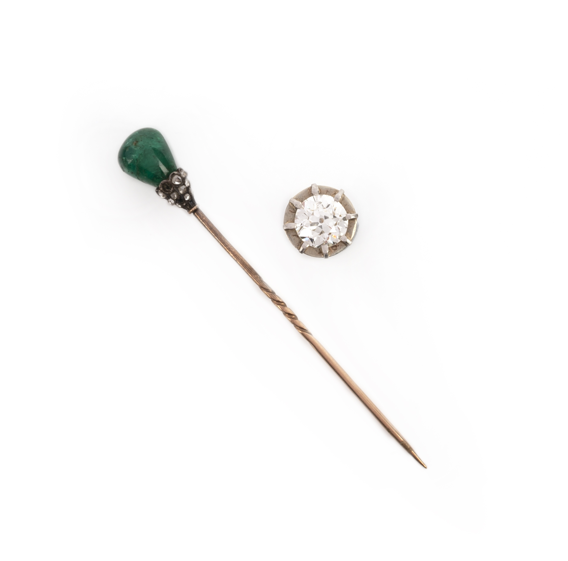 An emerald stick pin and a diamond stud earring, the stick pin capped with a polished emerald and rose-cut diamonds, mounted in silver and gold, length 6.8cm, one diamond deficient; the stud earring set with a circular-cut diamond weighing approximately 1.50 carats, mounted in low carat white gold, 1cm diameter including setting, post fitting