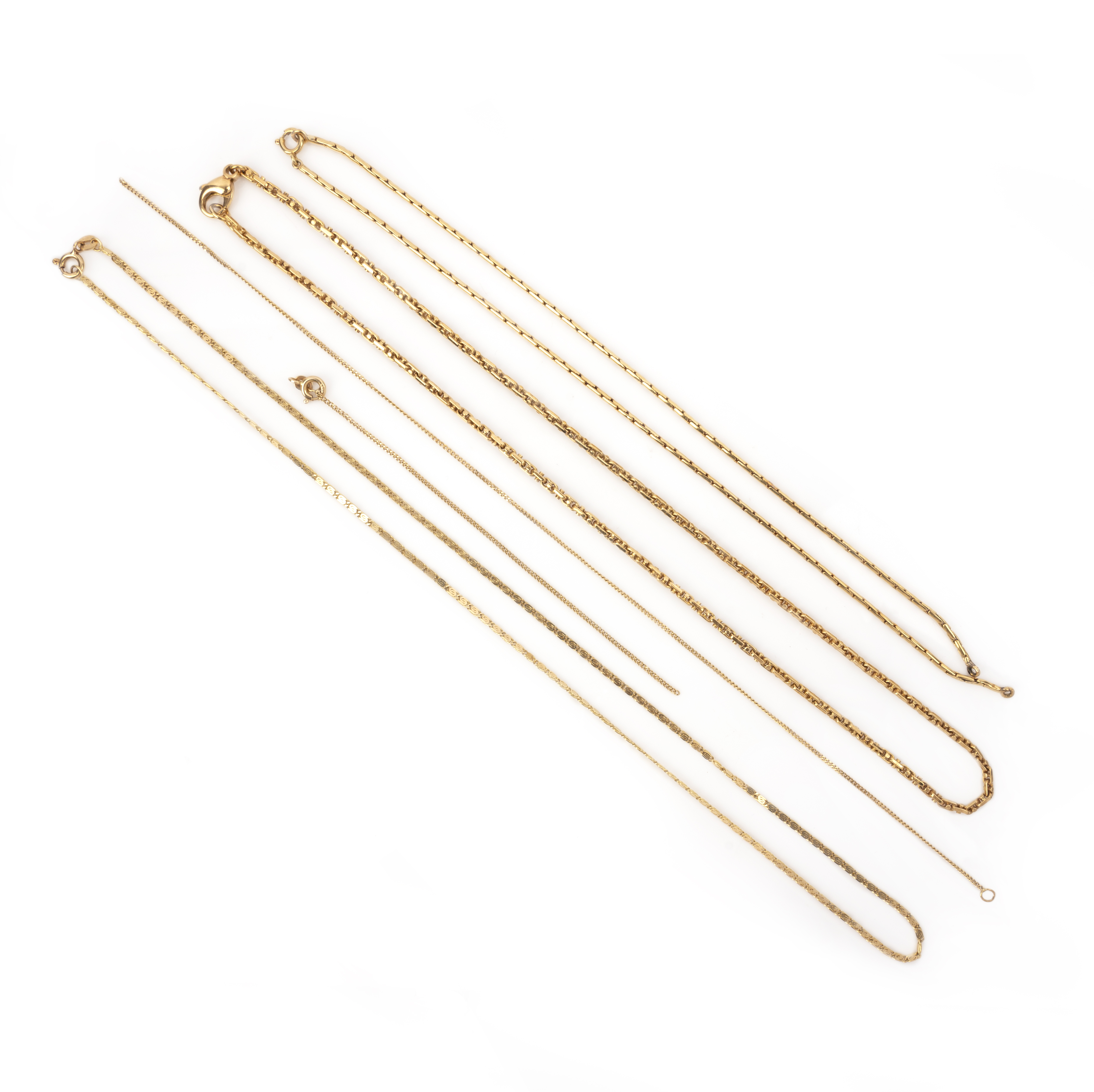 Four gold chain necklaces, comprising: three of fancy linking, one of which terminating in rings intended for a pendant, and one chain of fine curb linking, longest 50cm, one with British hallmarks for 18ct gold, one with French assay mark for 18ct gold, one stamped 585, fine curb chain broken, combined gross weight 36 grams