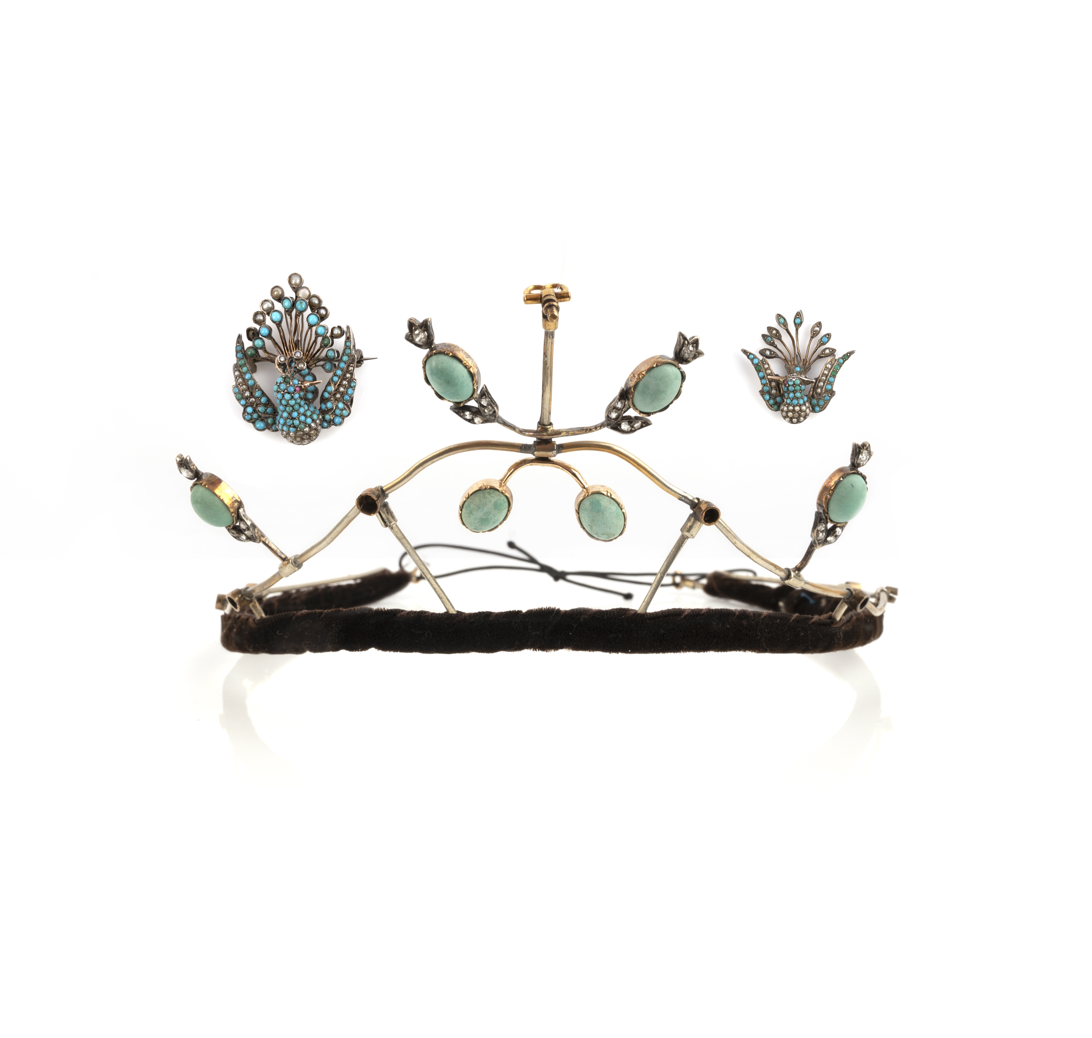 A turquoise and diamond tiara and pair of brooches, late 19th century, the tiara set with foliate spikes of turquoise cabochons and cushion-shaped and rose-cut diamonds, mounted in silver and gold on a steel frame, inner curve 39cm, height at centre 6cm, several detachable elements deficient; together with two brooches designed as birds in flight, pavé-set with turquoise cabochons and seed pearls, their eyes set with rubies, mounted in silver, 3.3 and 2.2cm respectively