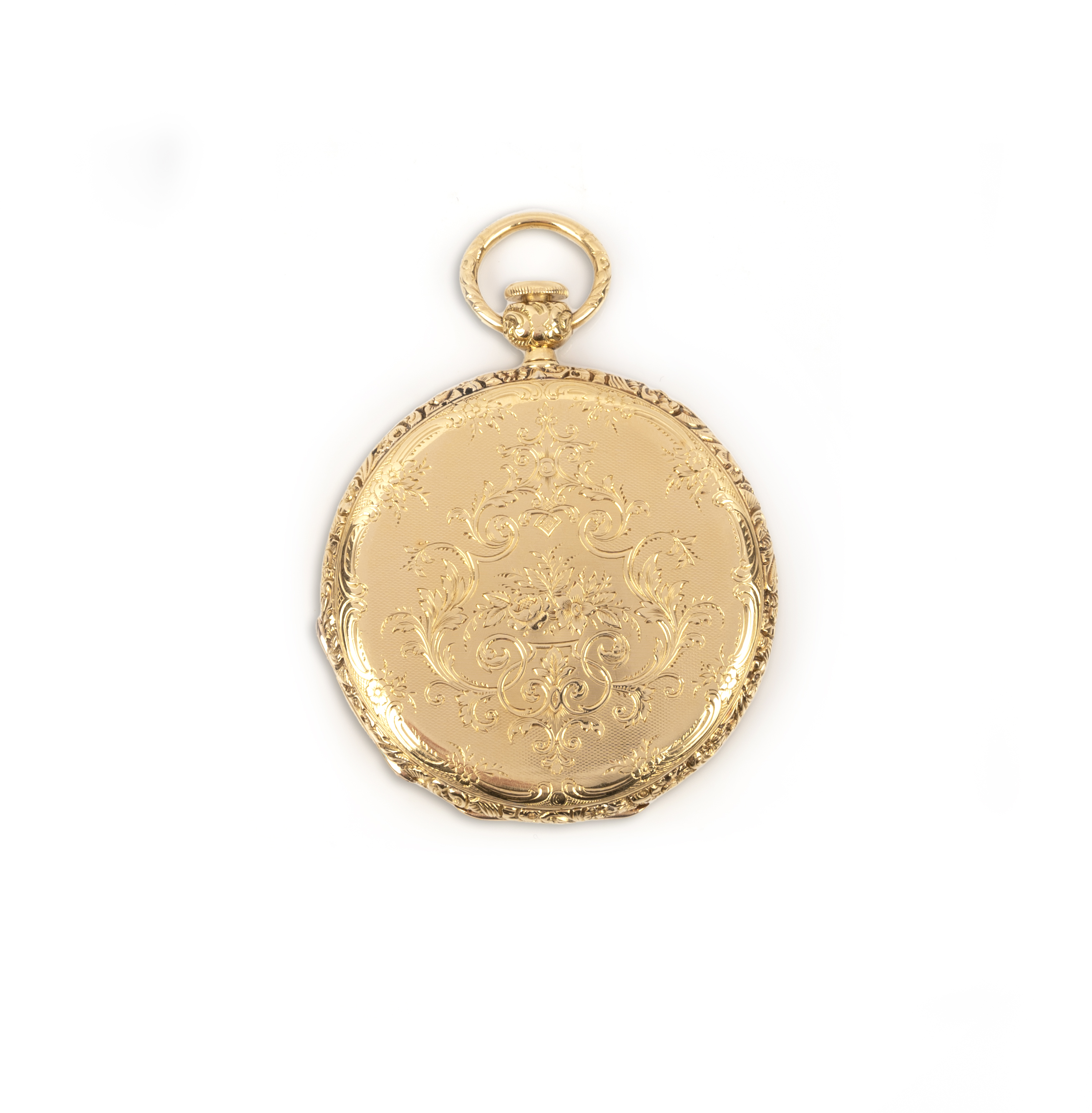 C. Longchamps & fils, a Swiss gold repeating pocket watch, white enamel dial with black Roman numerals, signed movement and plunge action repetition stricking on two gongs, the gold cover centred with initials within foliate scroll decoration repeated to reverse, inner case numbered 19099, Swiss control mark, 4.3cm diameter, 73g total