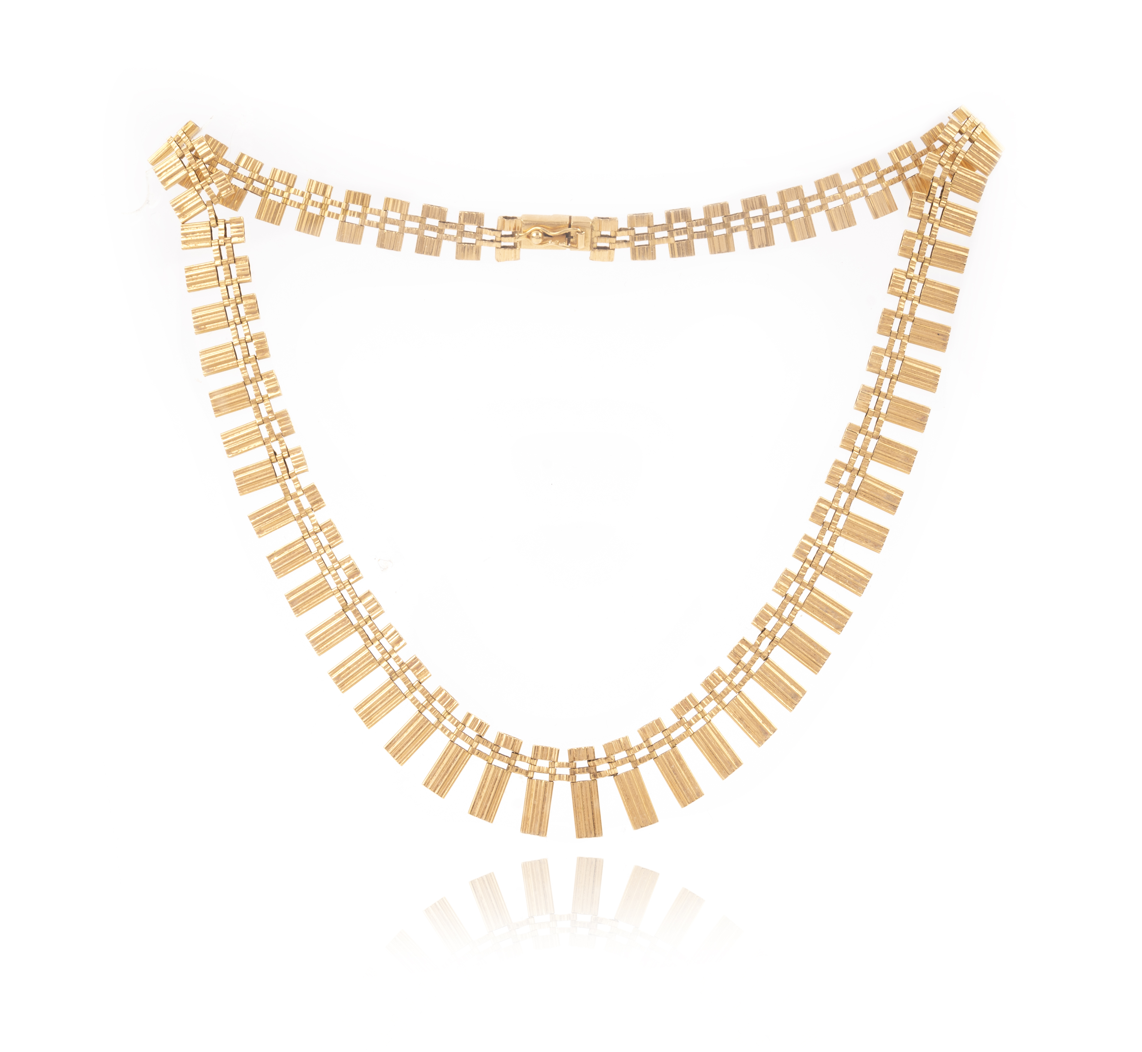 A gold necklace, mid 20th century, of fringe design in textured gold, length 42cm, stamped 750, partial assay marks, 28 grams