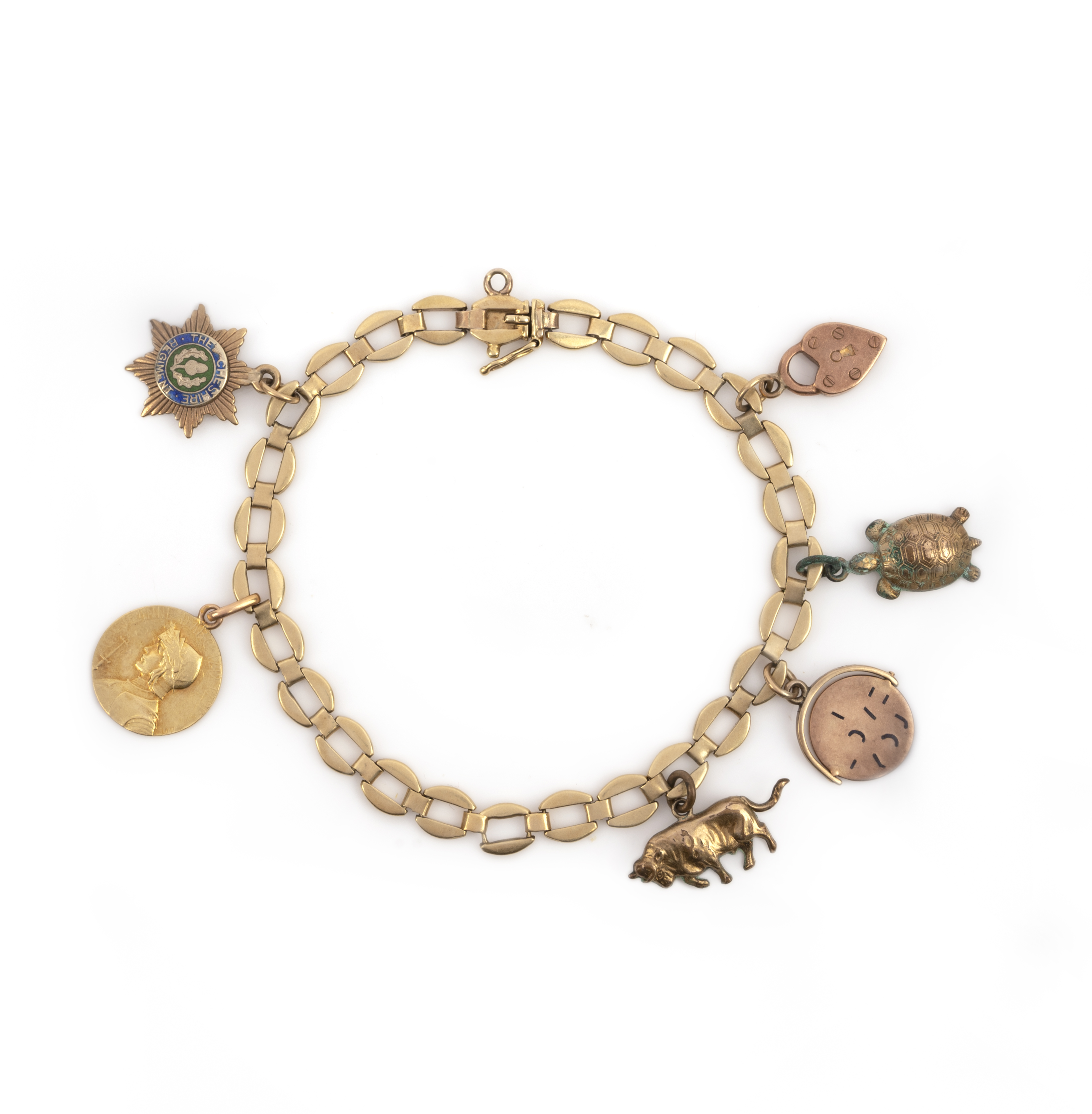 A gold charm bracelet, mid 20th century, the fancy link bracelet suspending six charms, including: a gold medallion depicting Joan of Arc, French assay mark for 18ct gold; a gold and enamel regimental badge for the Cheshire Regiment; a gold and enamel rotating disc charm reading 'I LOVE YOU'; a gold heart-shaped padlock charm; and two gilt metal charms depicting a bull and a tortoise, bracelet length 19cm, stamped 750; gross weight 19 grams