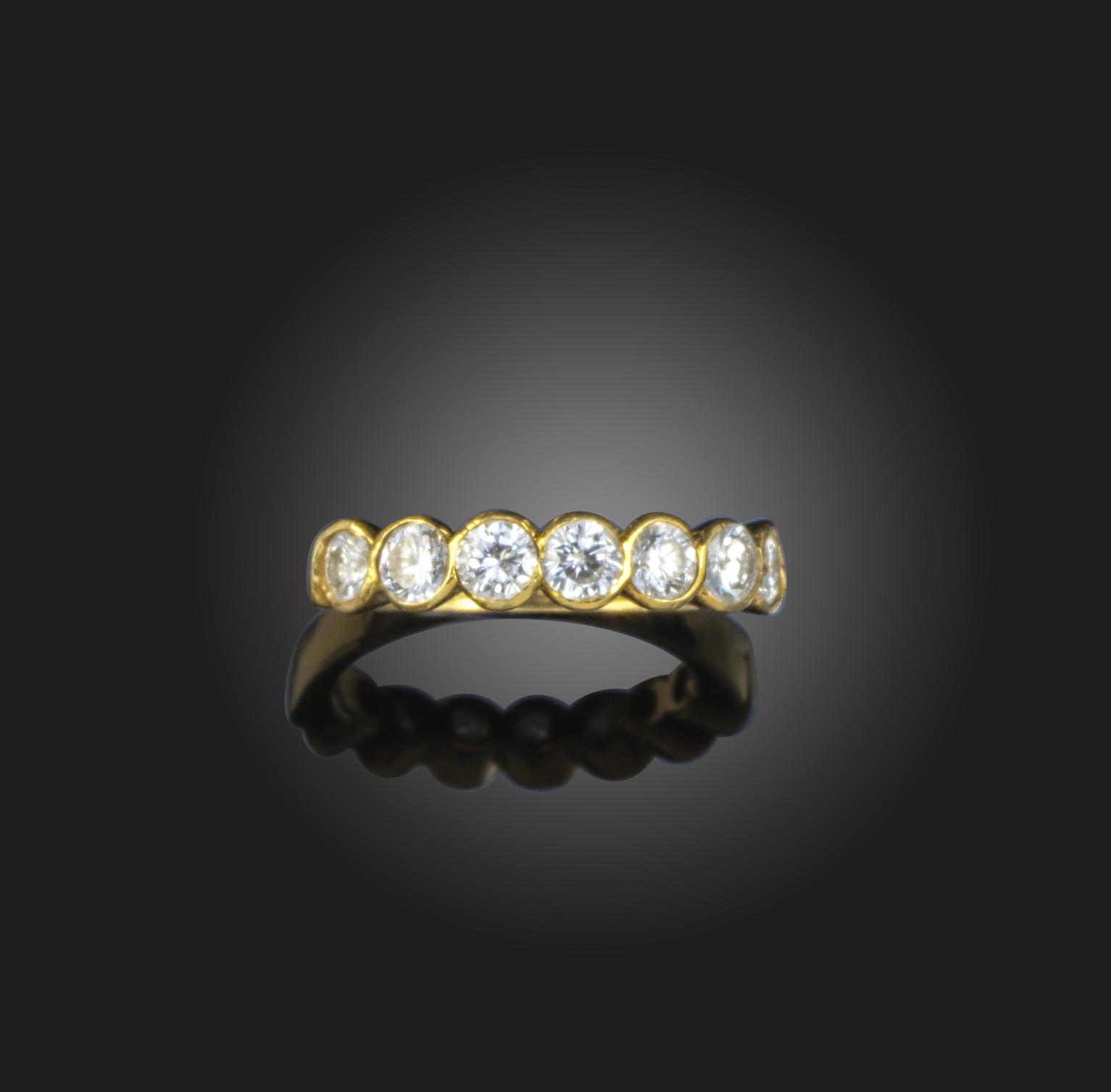 A diamond seven stone ring, the round brilliant-cut diamonds rubover-set in 18ct yellow gold, London hallmarks for 1990, size K
