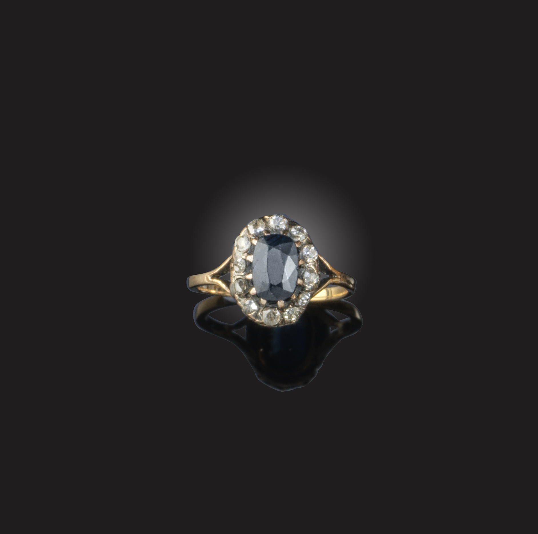 A sapphire and diamond ring, early 20th century, of cluster design, set with an oval sapphire