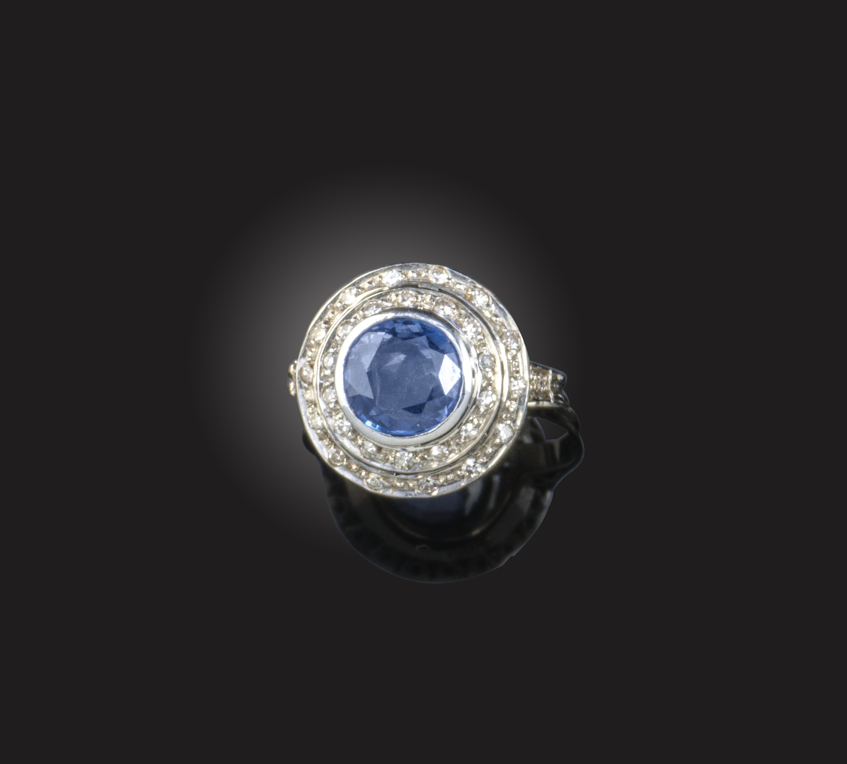 A sapphire and diamond ring, set with a central circular-cut sapphire within surrounds of single cut