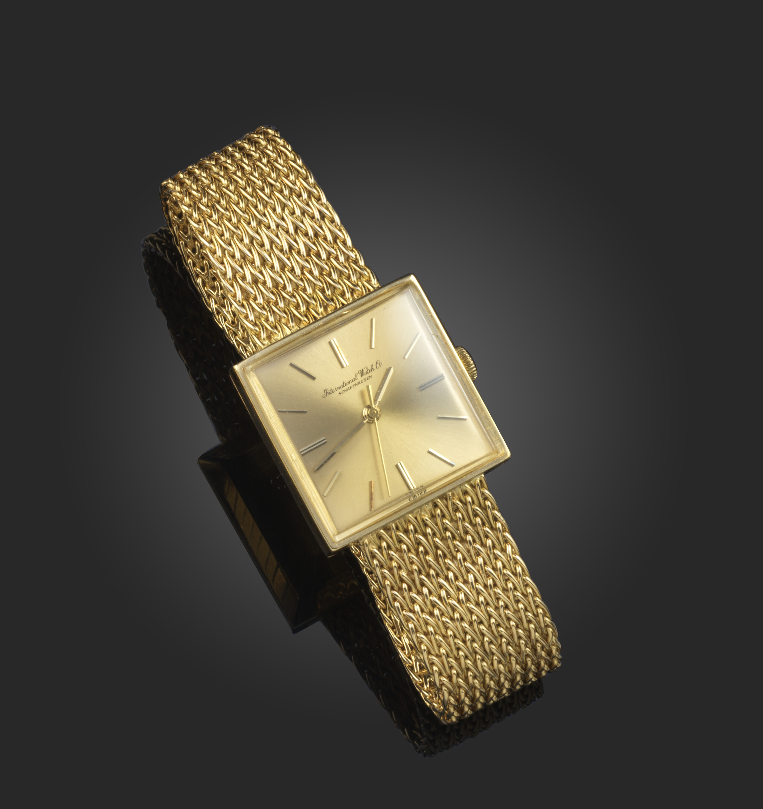 International Watch Co., a gold wristwatch, signed dial with baton numerals, in gold case on 18ct gold mesh band, London import marks for 1966, case width 2.7cm