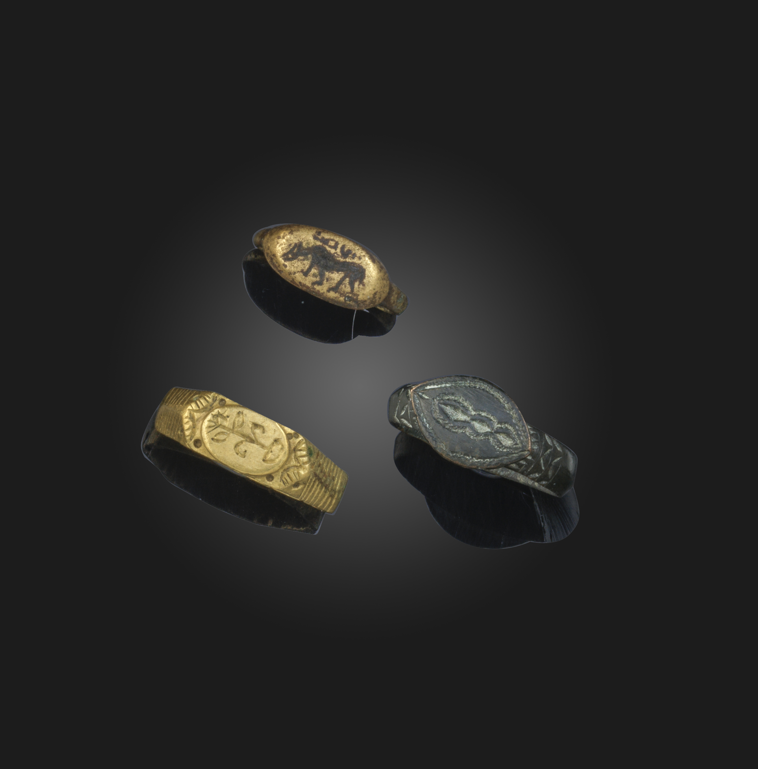 Three rings, Islamic, circa 1500, one in gilt metal depicting a cow, size J1/2; another in gilt metal centring on an oval cartouche depicting a flower, the shoulders with chevron engraving, size Q1/2; and a blackened base metal ring centring on an engraved navette-shaped cartouche, size S1/2