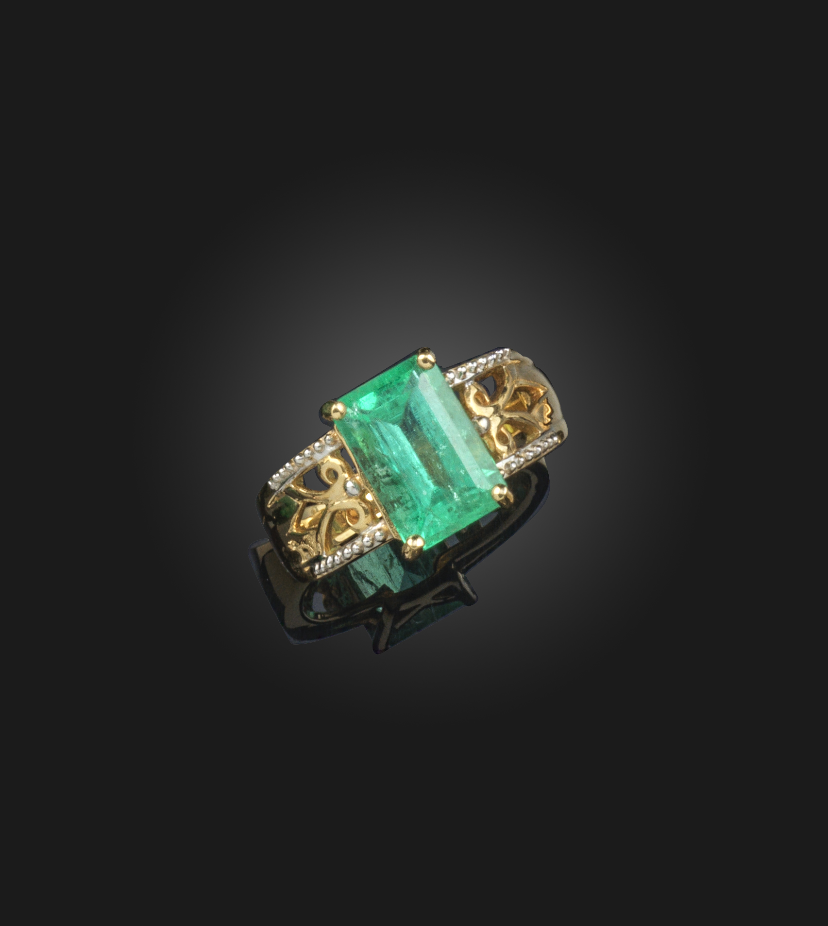 An emerald ring, claw-set with a step-cut emerald stated to weigh 3.42 carats, to a bicoloured 18ct gold mount, size N, British hallmarks