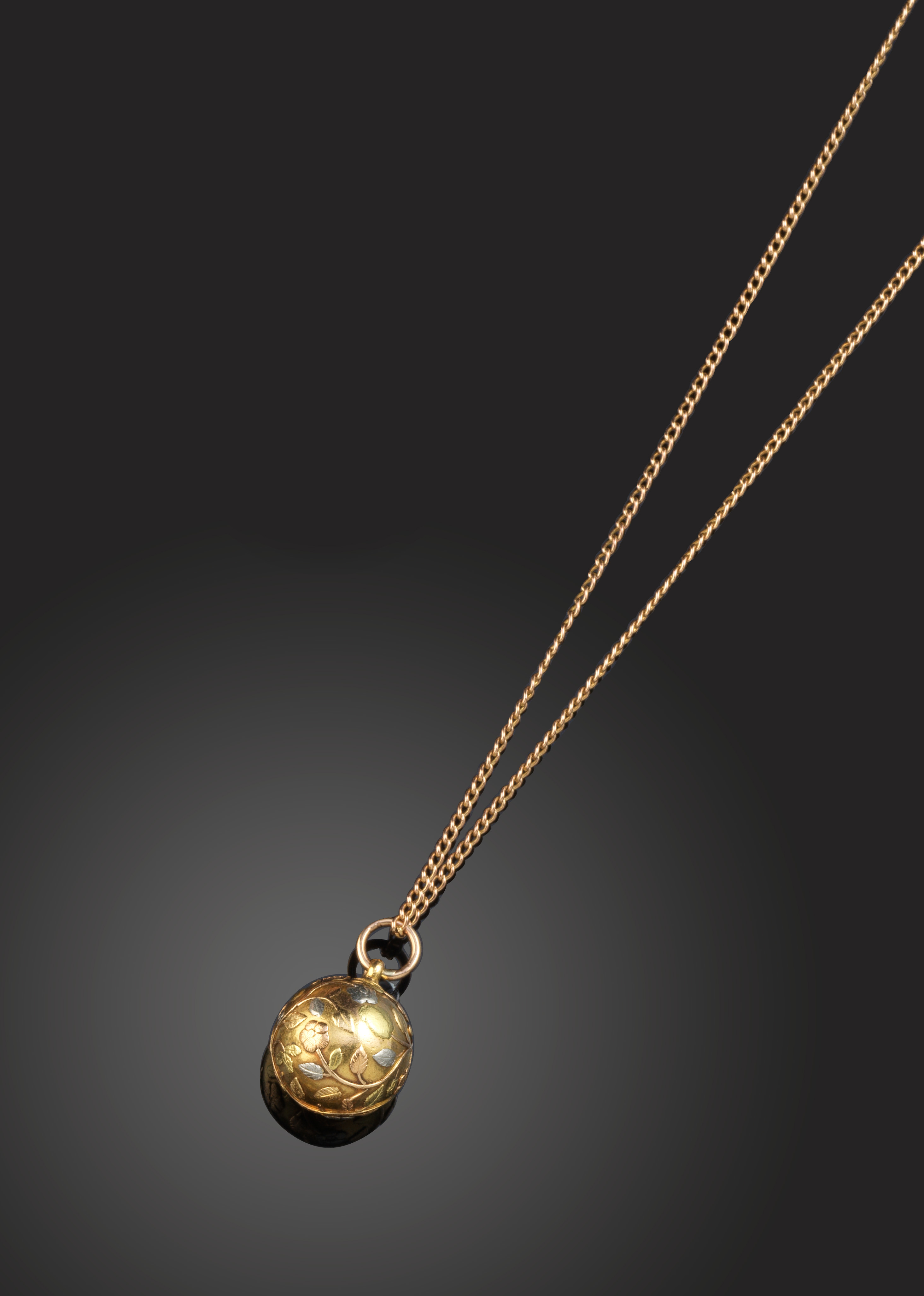 A Regency spherical gold pendant, with tricolour gold foliate decoration, width 14mm, suspended on a