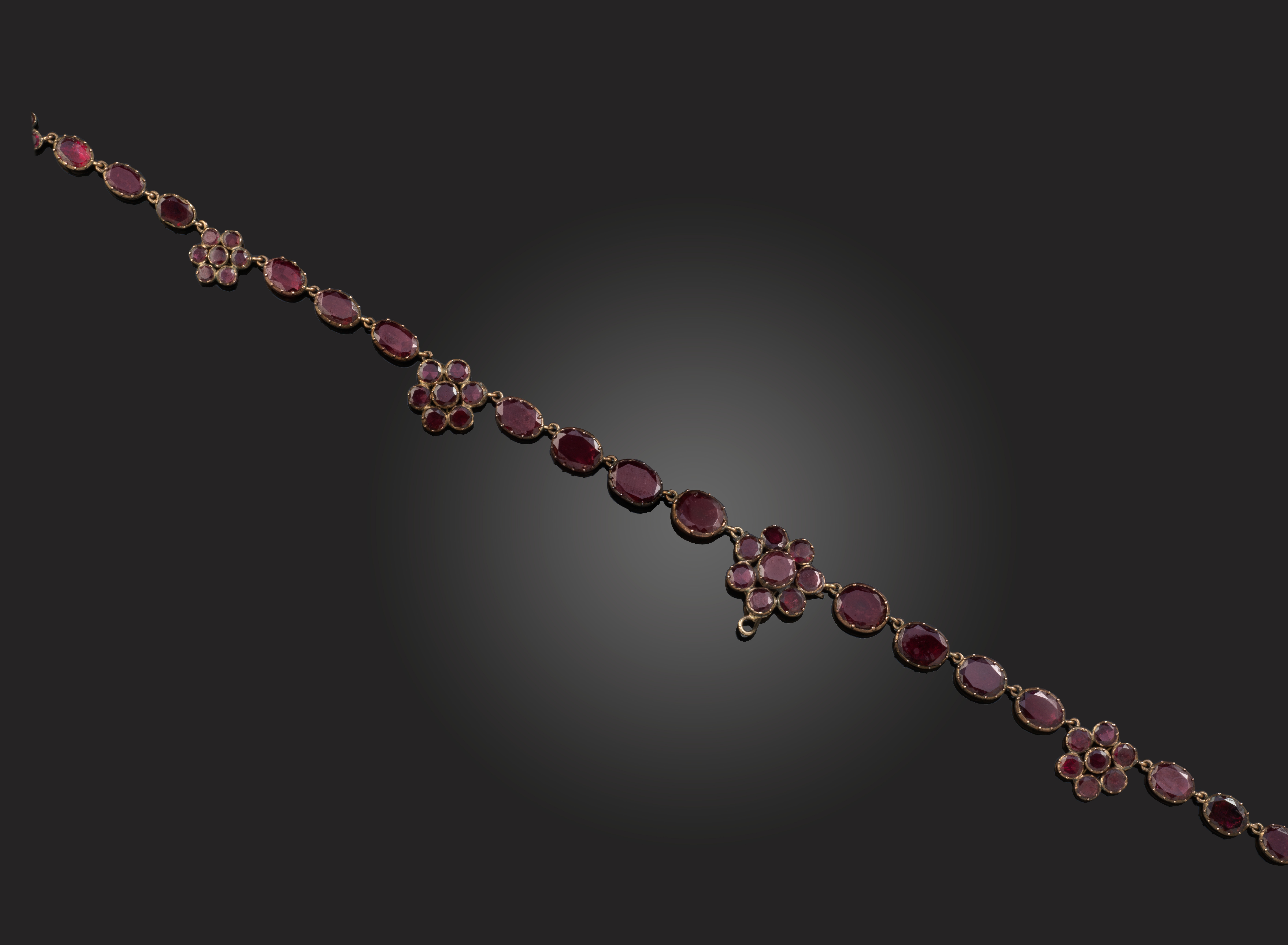 A garnet necklace and pair of earrings, 19th century and later, comprising: a necklace composed of