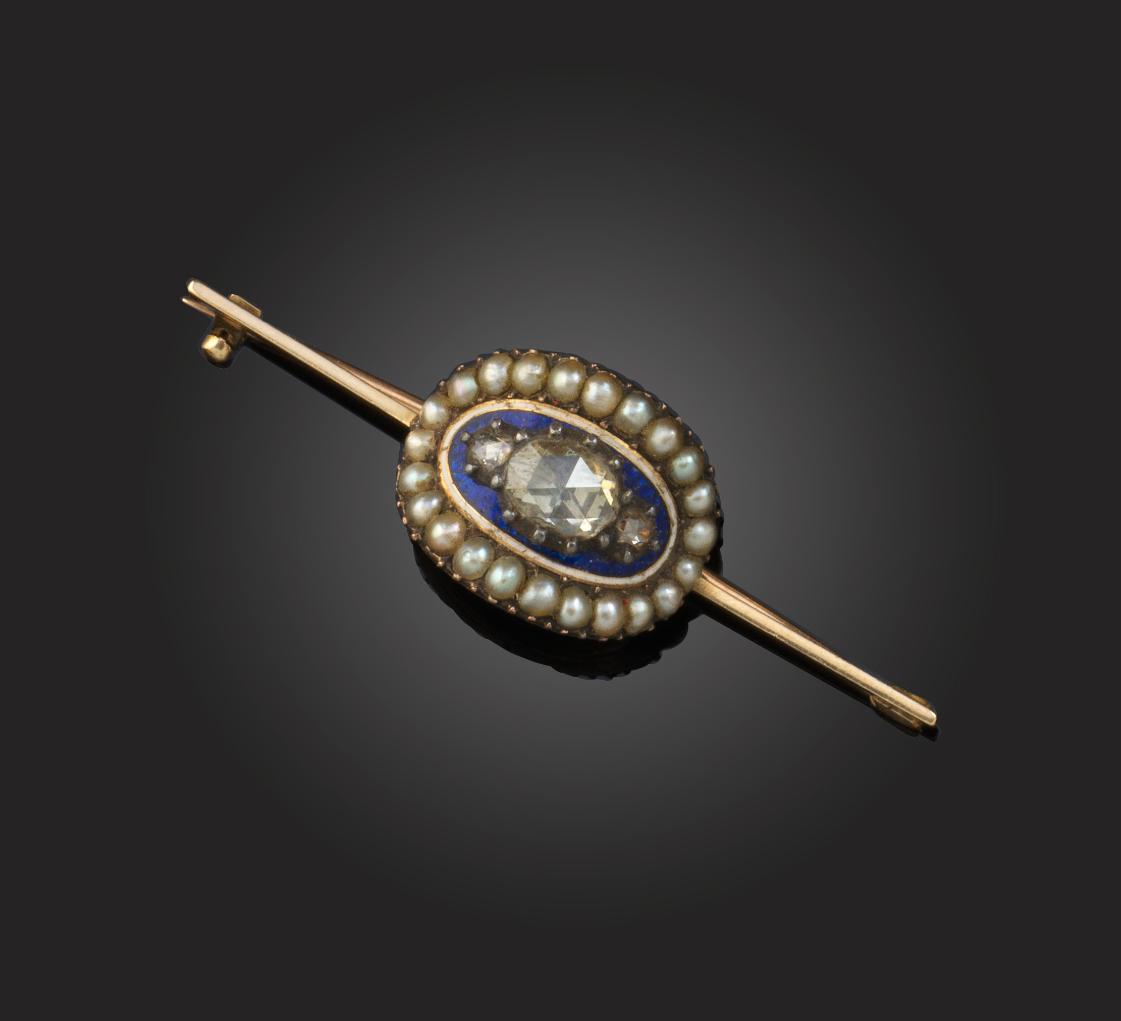 An enamel, diamond and seed pearl brooch, late 18th century and later, centring on a curved panel set with rose-cut diamonds, applied with blue and white enamel and bordered with half pearls, mounted in silver and gold, to a later gold bar brooch, length 5.5cm, case stamped Goldsmiths and Silversmiths Company