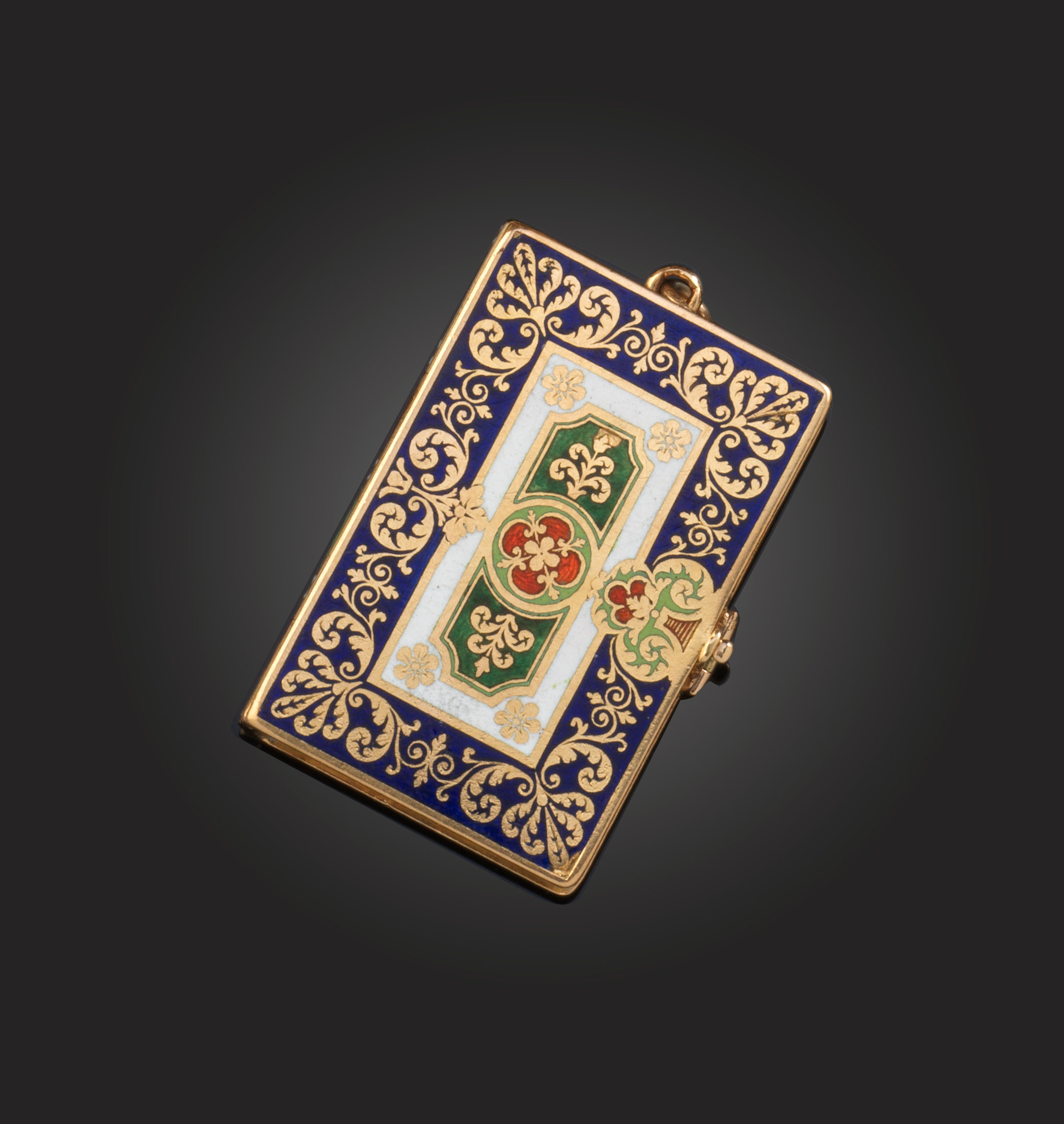 A gold and enamel locket pendant, France, circa 1819-1838, designed as a book, its front and back covers applied with red, white, blue and green enamel, opening to reveal a hinged series of rectangular locket compartments containing photographs, pendant length 4cm including suspension hoop, early 19th century Parisian assay mark for 18ct gold, maker's mark GRM with ear symbol, hinged photo frames possibly a later addition