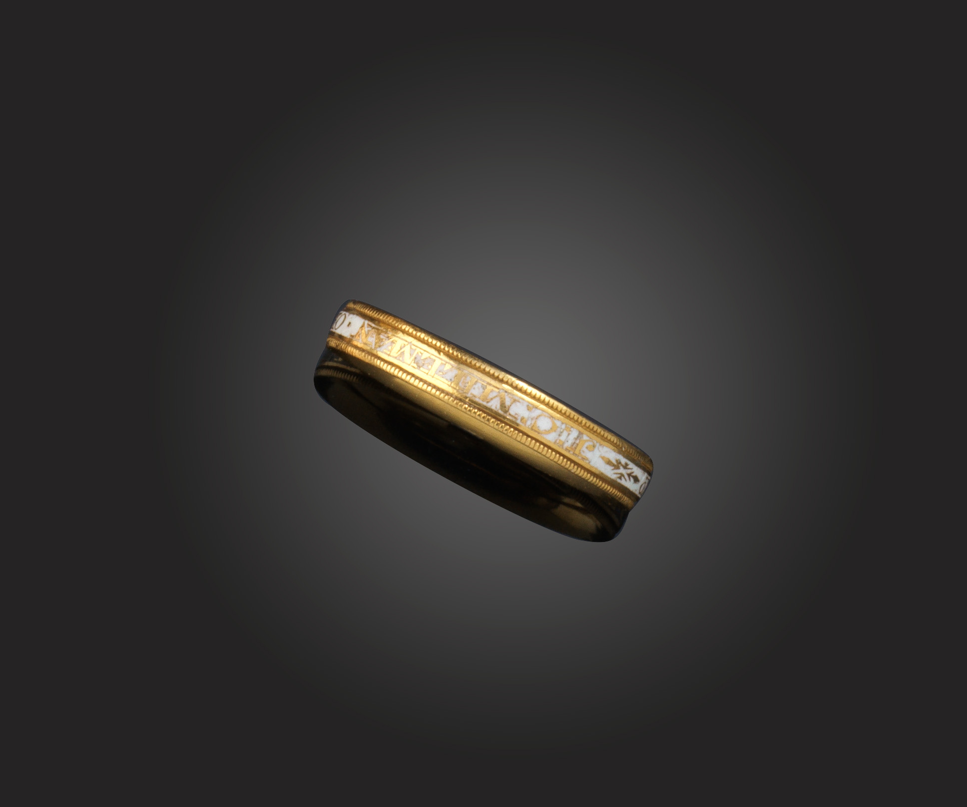 A late 18th century white enamel mourning ring, with inscription in gold lettering for J.C.Mileman