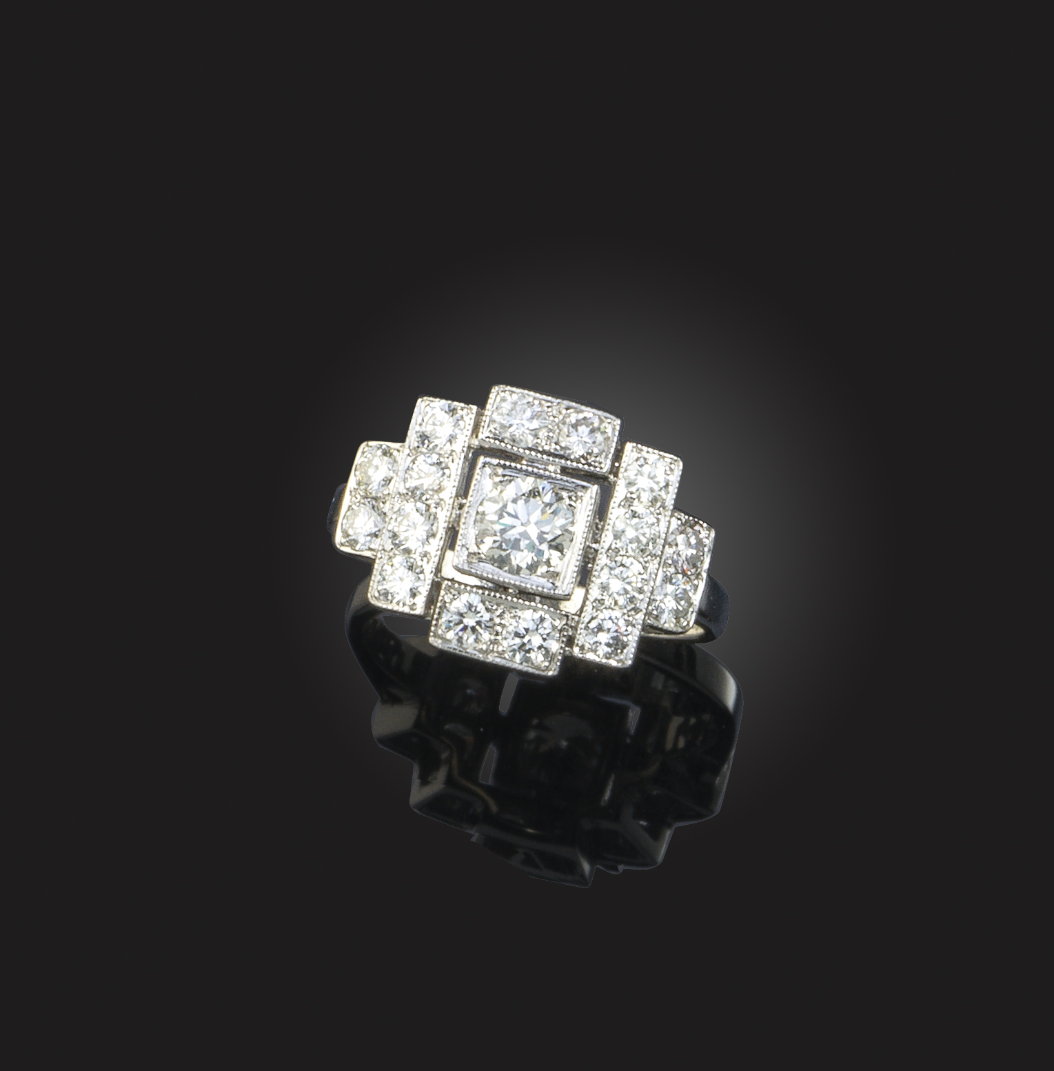 A diamond cluster ring, of geometric design set with graduated circular-cut diamonds in platinum,