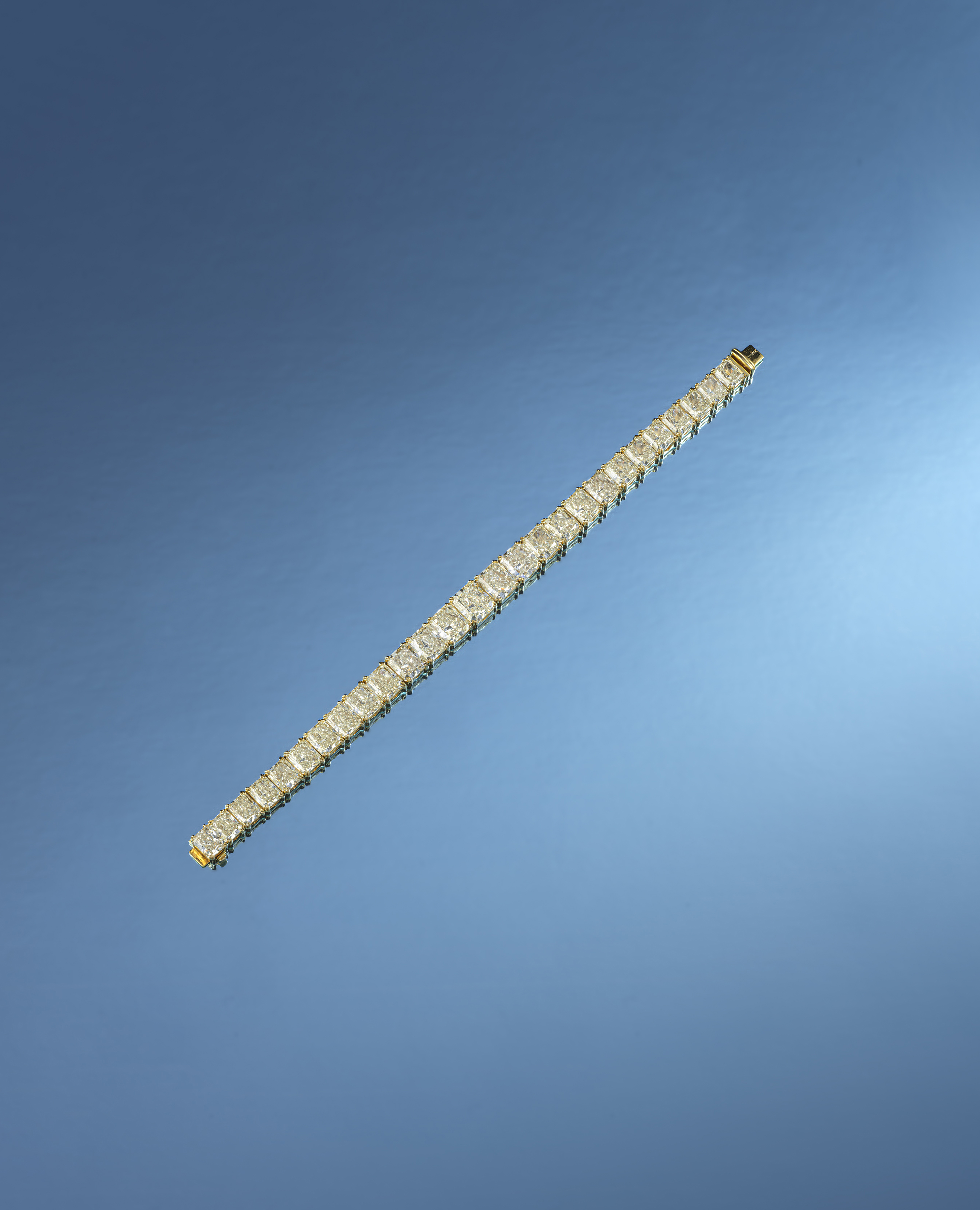 Formerly the property of Elizabeth Taylor, a diamond line bracelet, set with 27 graduated radiant-cut diamonds of yellow tint, claw-set in yellow gold, the central diamond weighing 3.38cts, length 18cm