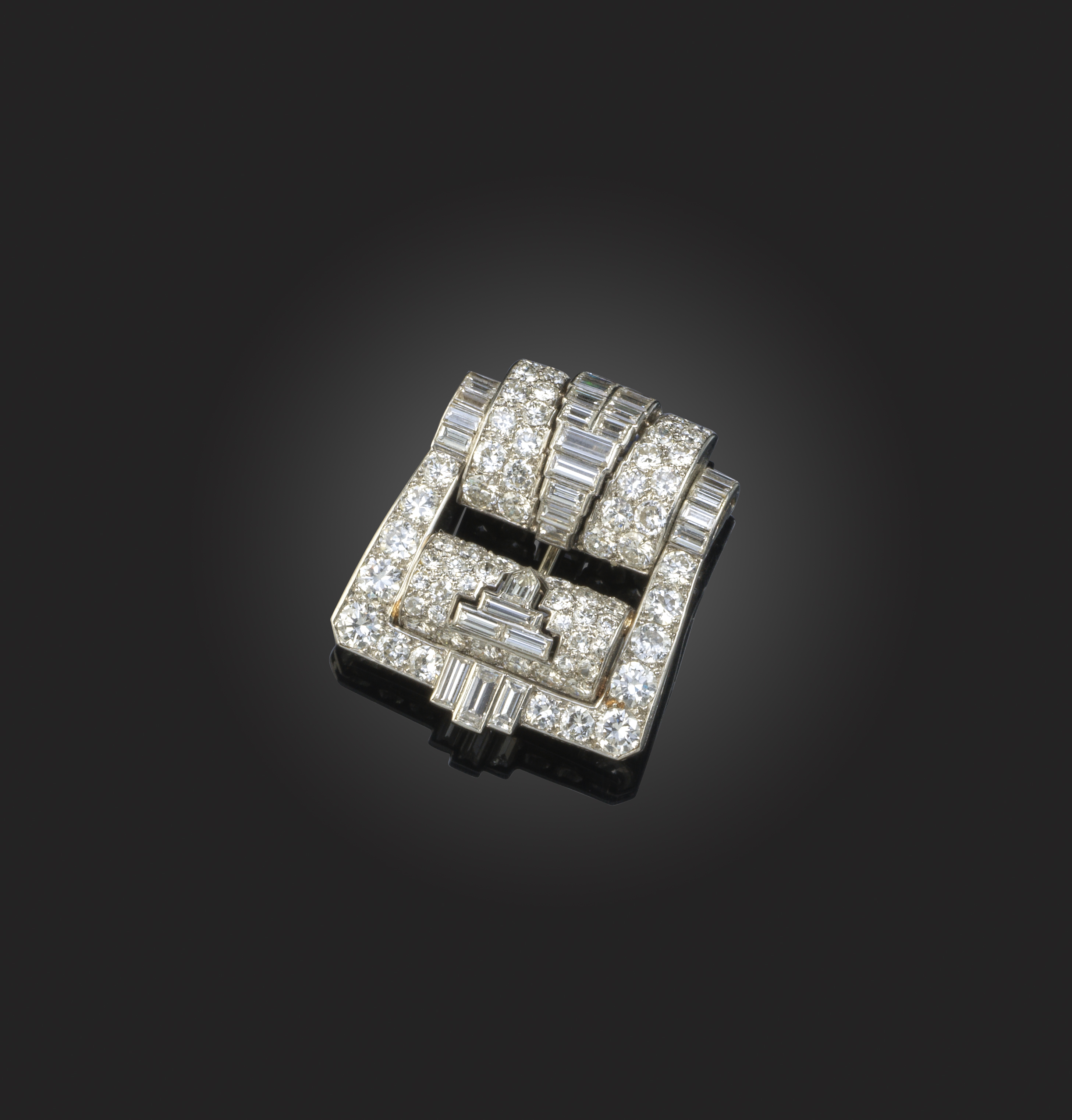Cartier, an Art Deco diamond brooch, circa 1935, of geometric buckle design, set with circular-cut, brilliant-cut, baguette and shield-shaped diamonds totalling approximately 9.00-10.00 carats, mounted in platinum, length 3.5cm, signed Cartier London, stamped Pt950 for platinum, diamonds, later brooch fitting