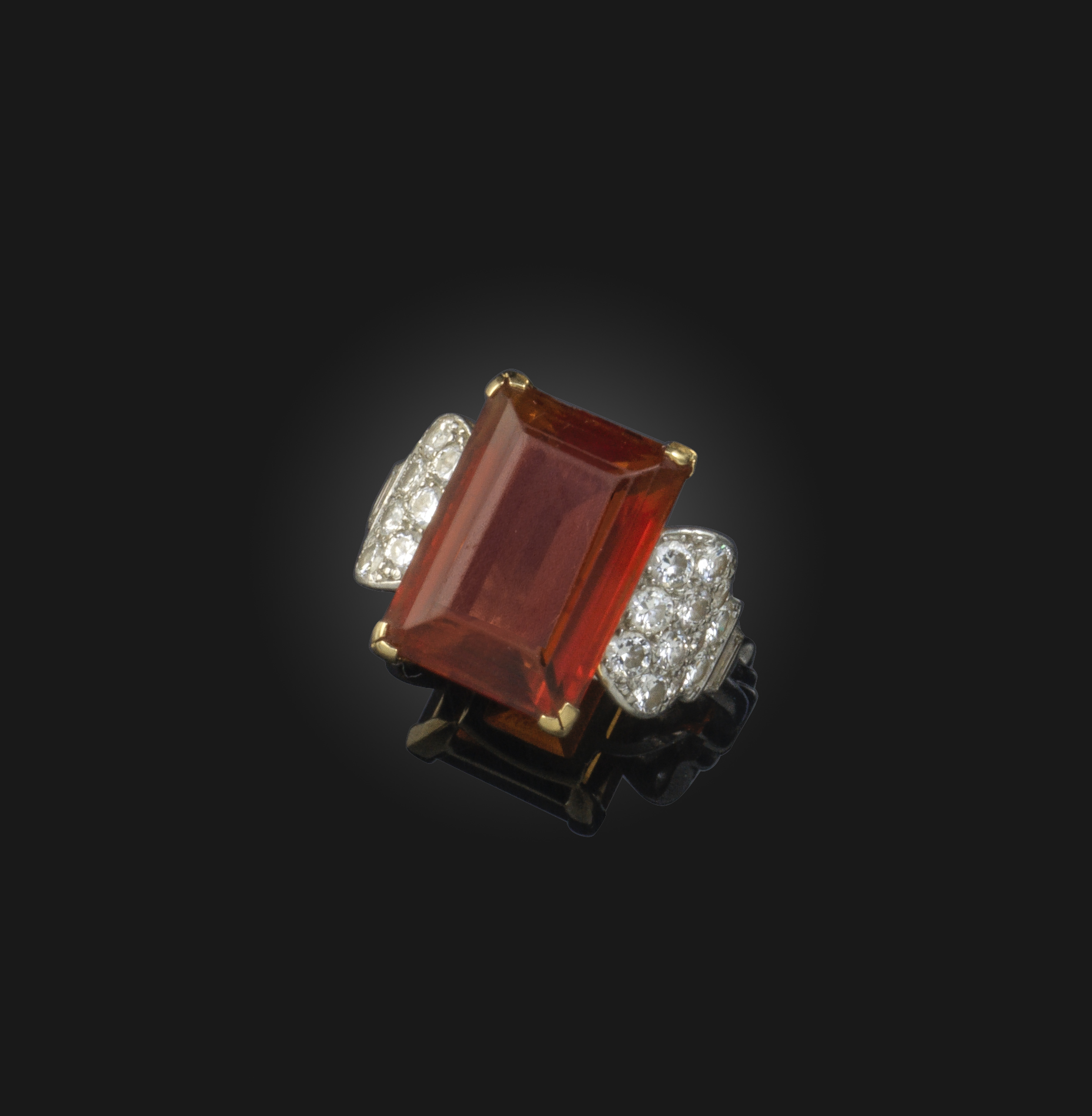 Attributed to Cartier, a citrine and diamond ring, circa 1938, claw-set with a step-cut citrine, to