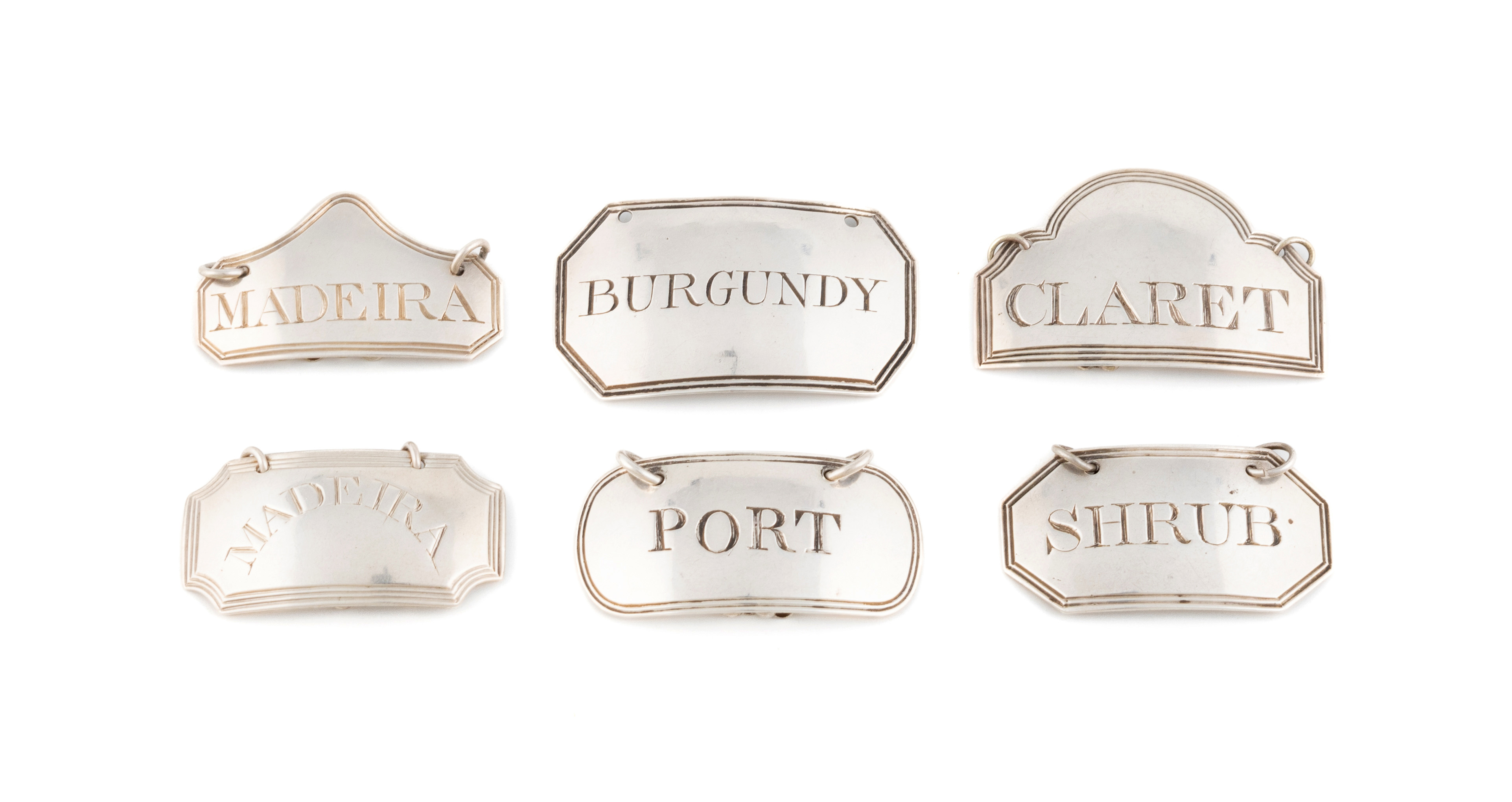 comprising: one by Elizabeth Morley, London 1799, incised 'Madeira', one by Peter and William Bateman, London 1811, incised 'Port', one by Thomas Wallis, London 1803, incised 'Shrub', one by Susannah Barker, London circa 1790, incised 'Madeira', one by Abstinando King, London 1797, incised 'Claret' and one possibly by Charles Hougham (maker's mark CH), incised 'Burgundy', total approx. weight 1.4oz. (6)