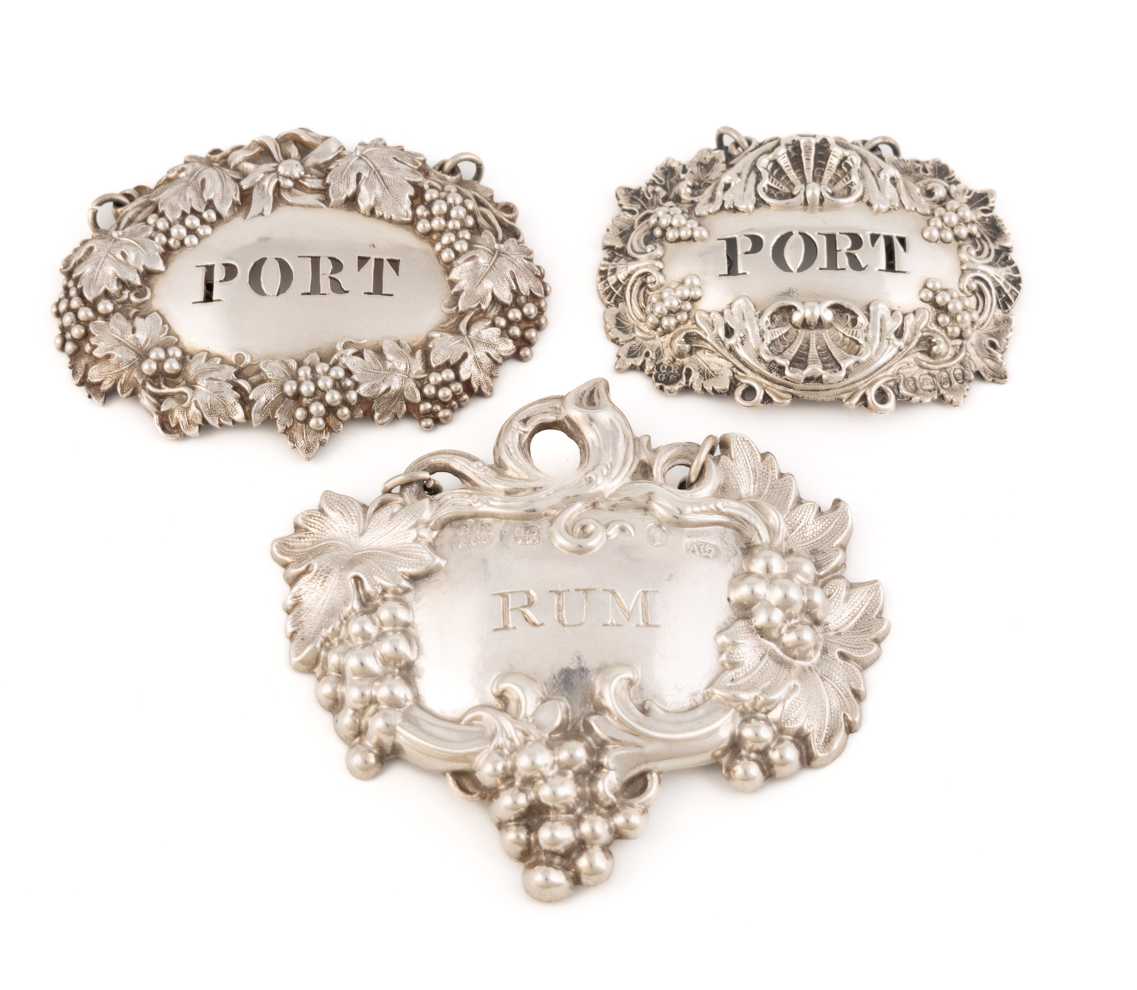 shaped oval form with grape and vine decoration, incised 'Rum', length 7.8cm, plus a label by Reily & Storer, London 1839, pierced 'Port', and one possibly by William Bateman, London 1826, pierced 'Port', total approx. weight 2oz. (3)
