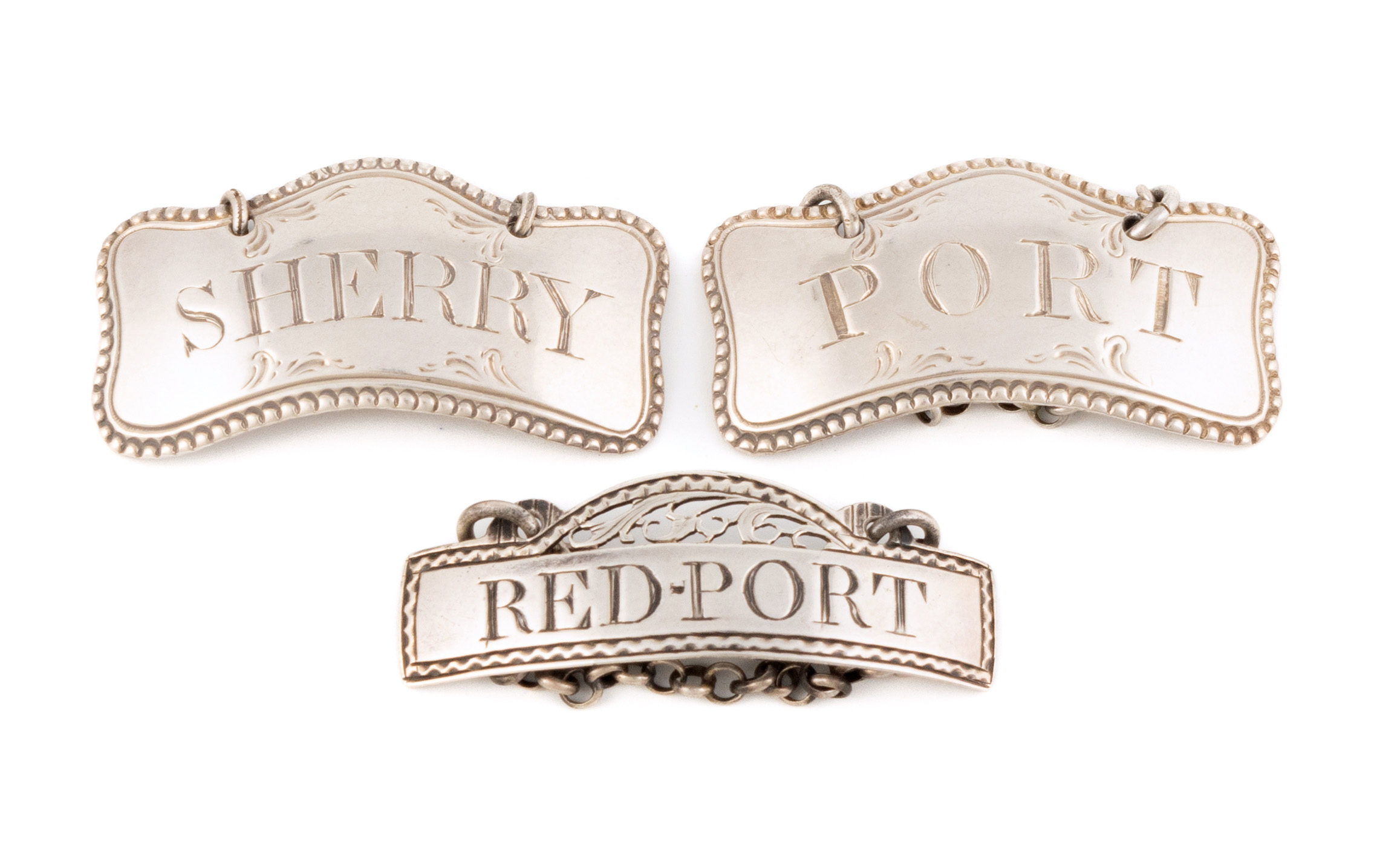 narrow arched rectangular form, pierced decoration, incised 'Red.Port', length 4.6cm, plus a pair possibly by John Hutson, London circa 1784, incised 'Port' and 'Sherry', total approx. weight 0.8oz. (3)